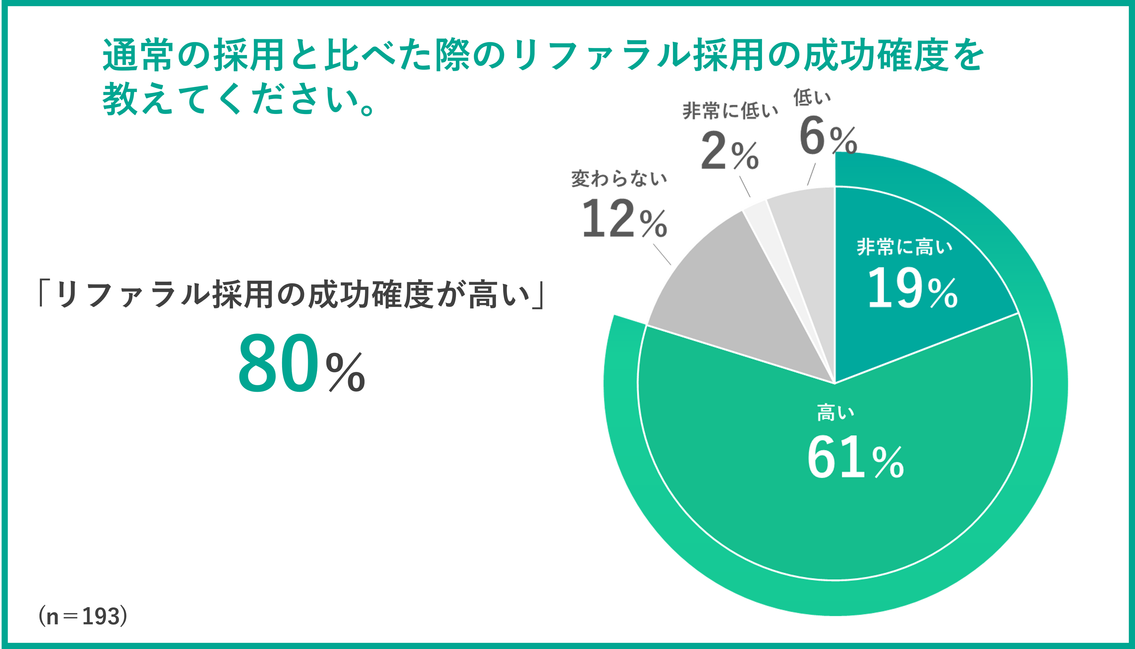リファラル採用の成功確度が通常採用よりも高い(「非常に高い」(19%)+「高い」(61%))とする企業が80%にのぼりました。