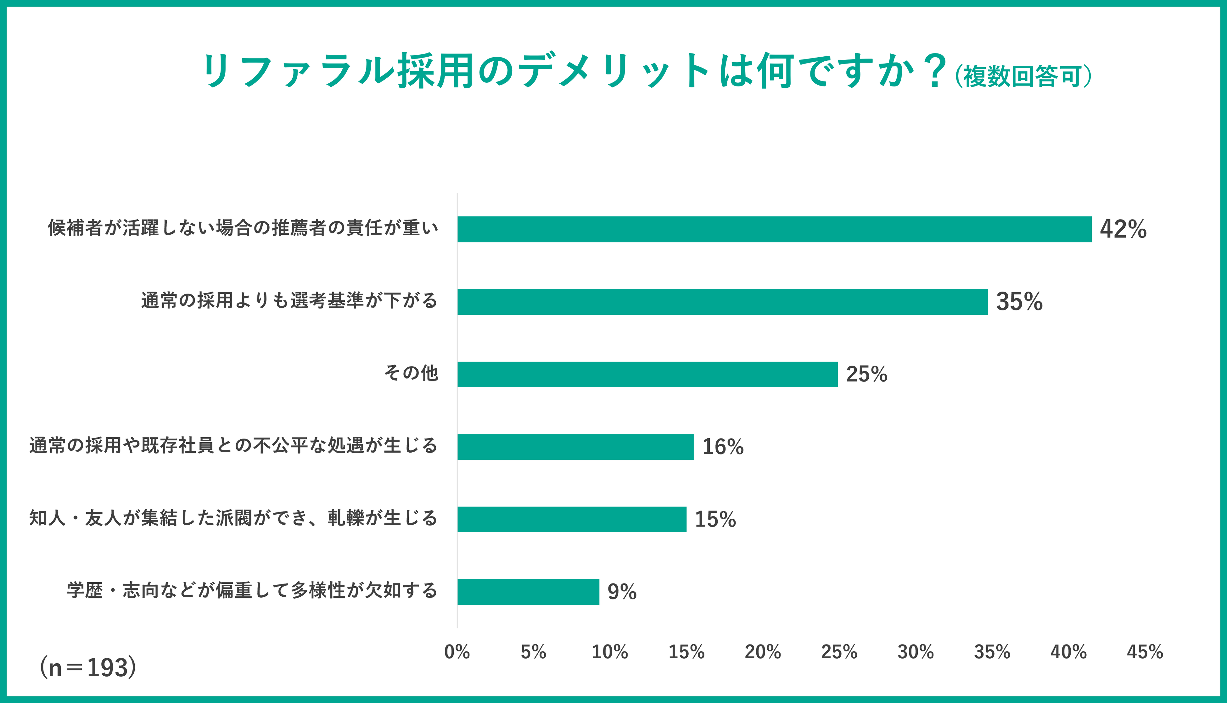 一方でデメリットでは、「候補者が活躍しない場合の推薦者の責任が重い」(42%)が最も多い結果となりました。推薦者と候補者の人間関係だけでなく、仕事や組織にも影響を与える可能性がある為、配慮する必要があると考えられます。