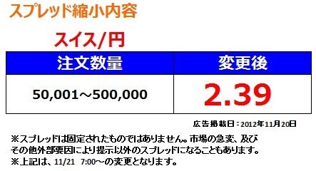 そして、8回目となる今回はスイスフラン/円で60%以上のスプレッド縮小となり、5万1~50万通貨までを共通スプレッドの2.39銭にて提供することを決定いたしました。