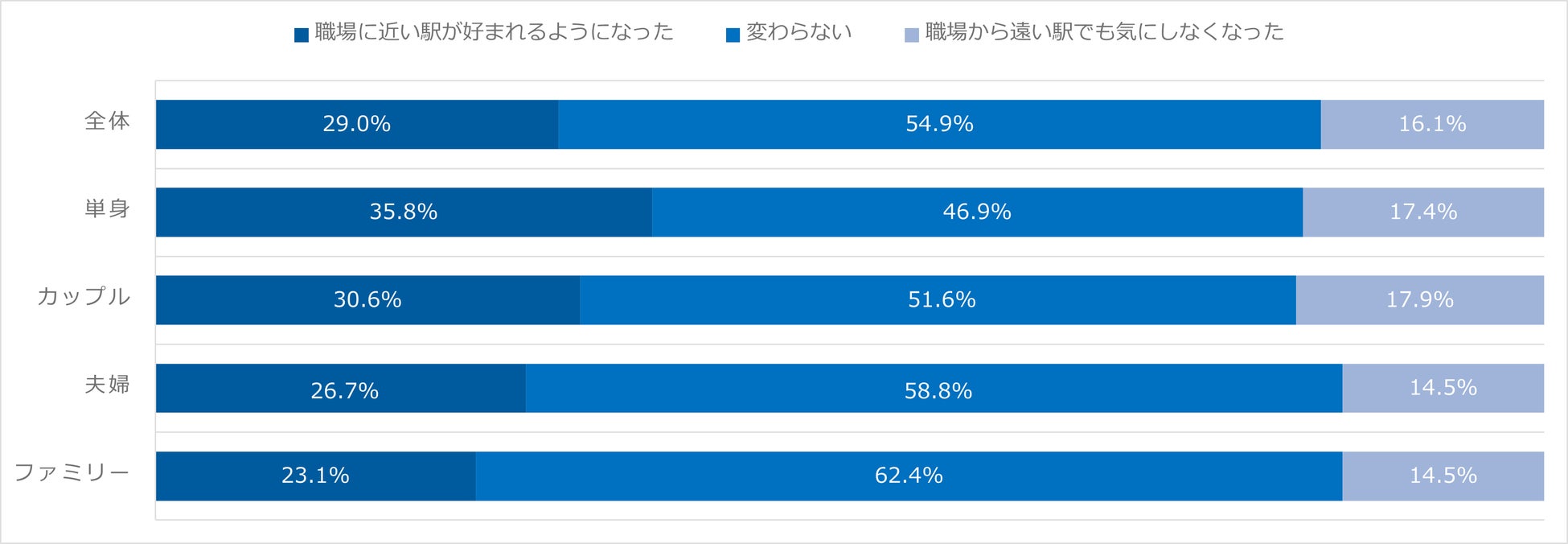 「駅距離」を気にしないファミリーの比率は前回21.9%から13.0%、夫婦の比率は18.3%から11.4%に減少しており、「駅近物件」を希望する方が増えている状況です。同様に「職場までの距離」を気にしないファミリーの比率は前回21.9%から14.5%、夫婦の比率は18.3%から11.4に減少し、職場へのアクセスを重視する方が増加傾向にあると言えます。
