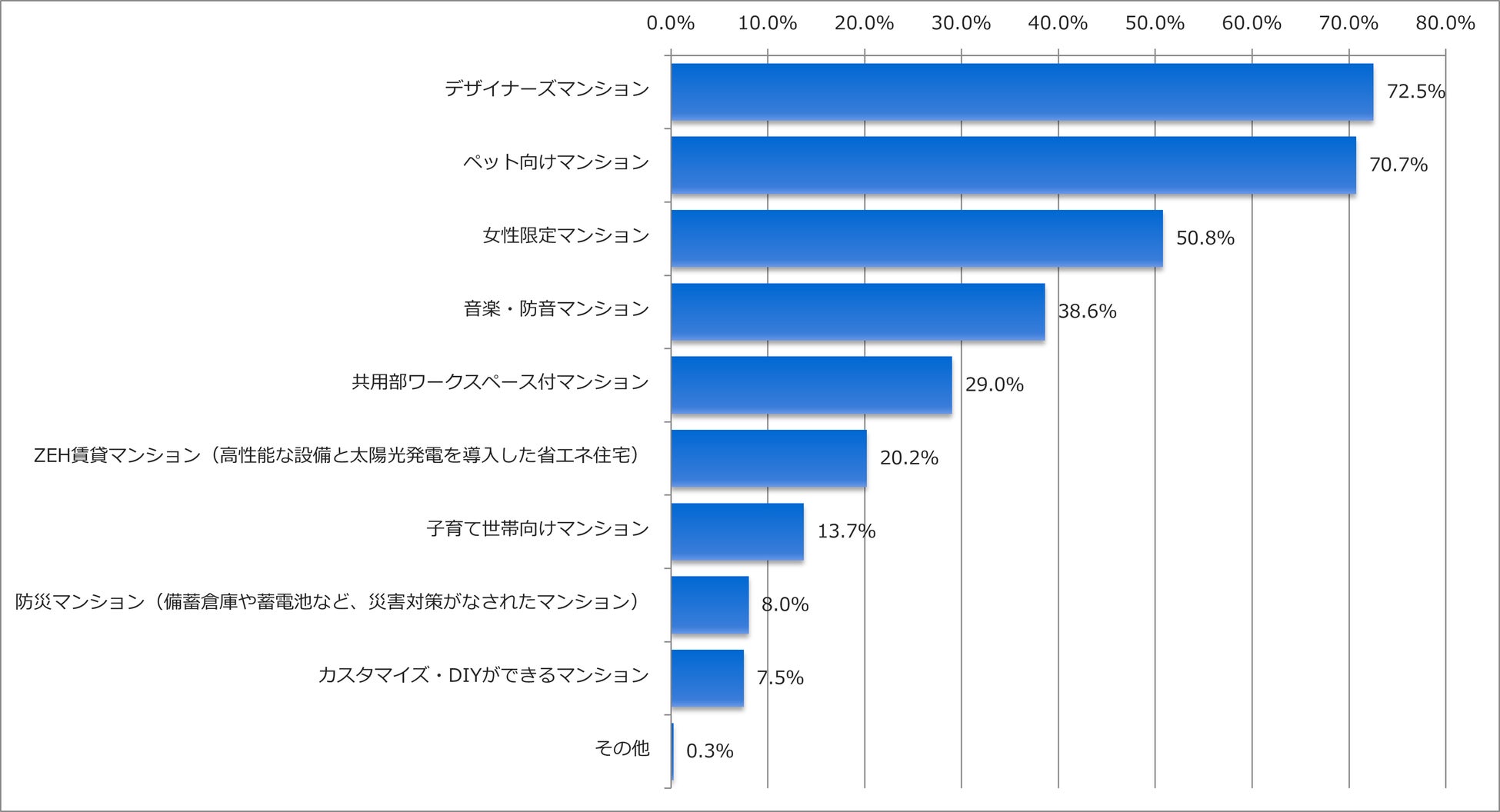 デザイナーズマンションとペット向けマンションを紹介したことがある仲介担当者が70%を超える結果となりました。ZEHマンションを紹介したことがある仲介担当者も20.2%おり、SDGsへの関心の高まりから、環境性能を意識した賃貸マンションが増えてきており、紹介する機会があるものと考えらます。