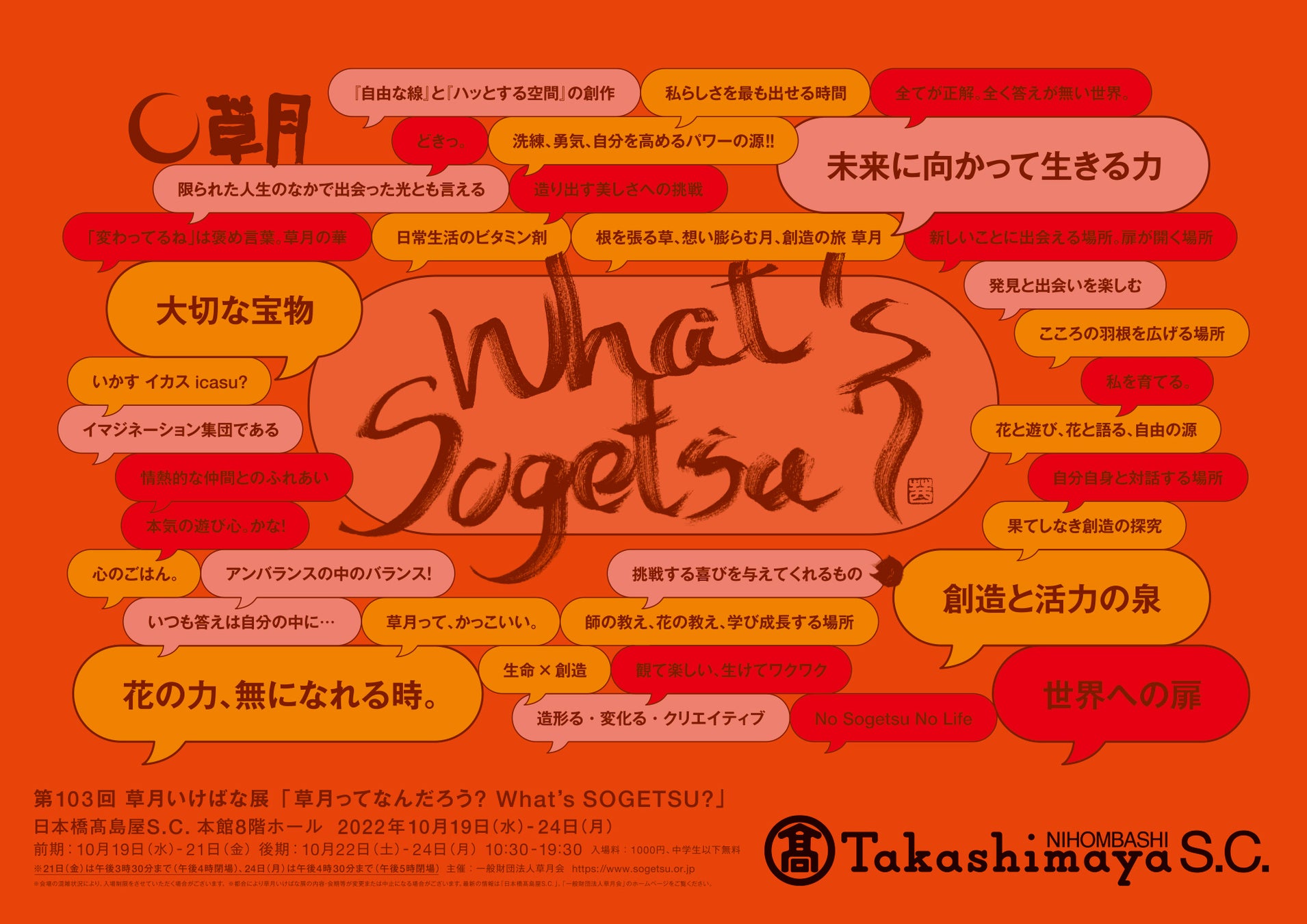 今回は2027年に迎える創流100周年を見据え、自らを見つめ直す問いかけである「草月ってなんだろう? Whatʼs SOGETSU?」をテーマに取り組みます。