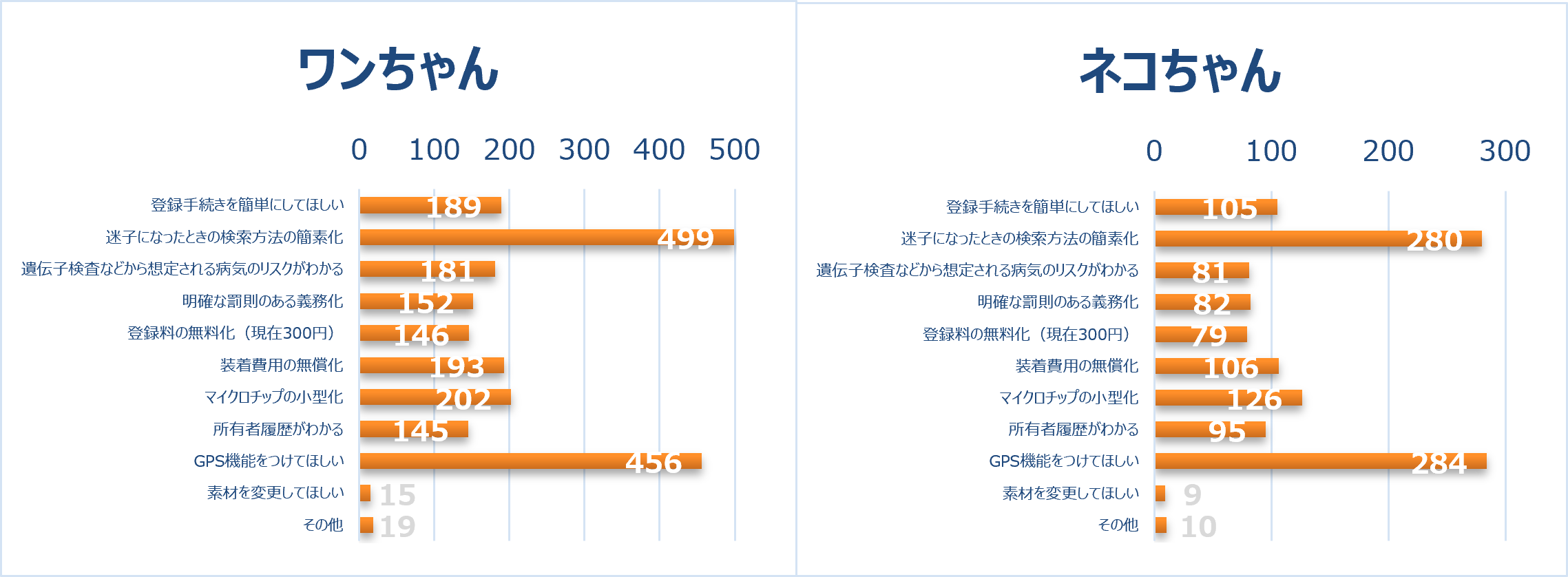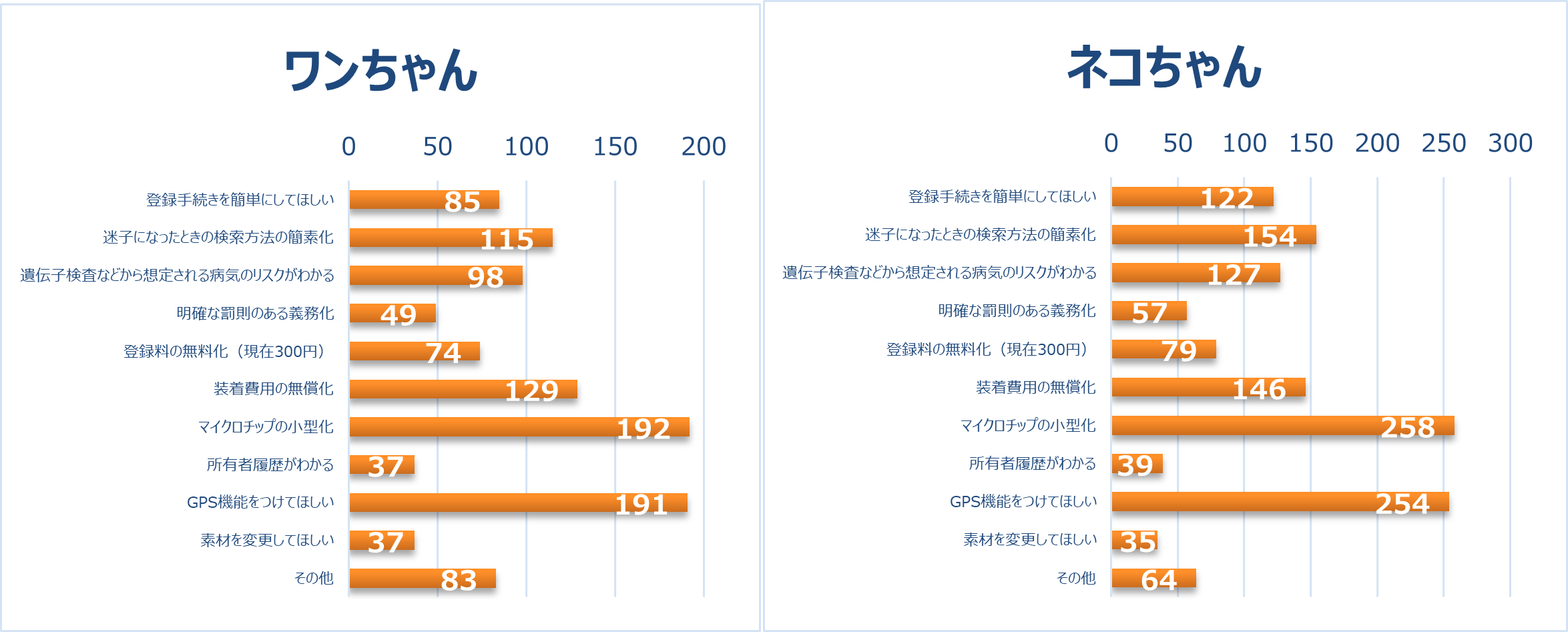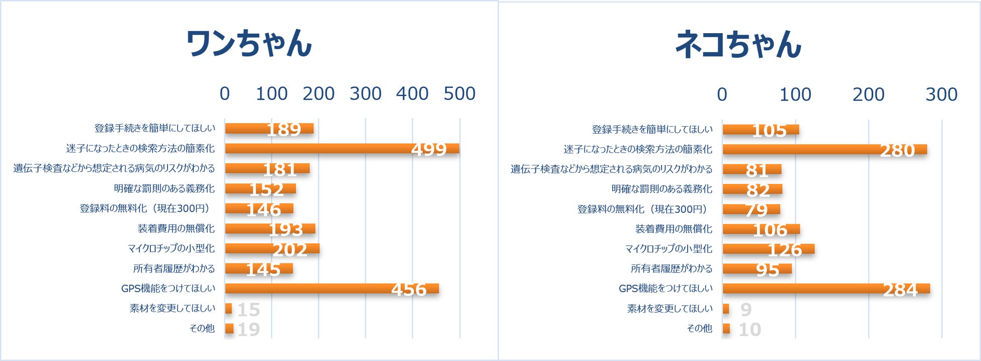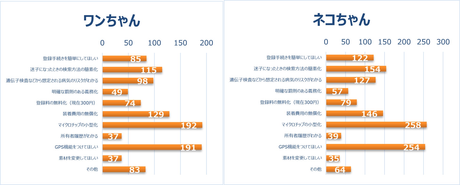マイクロチップ装着検討のための改善要望上位:【犬・猫共通】1位「マイクロチップの小型化」、2位「GPS機能」