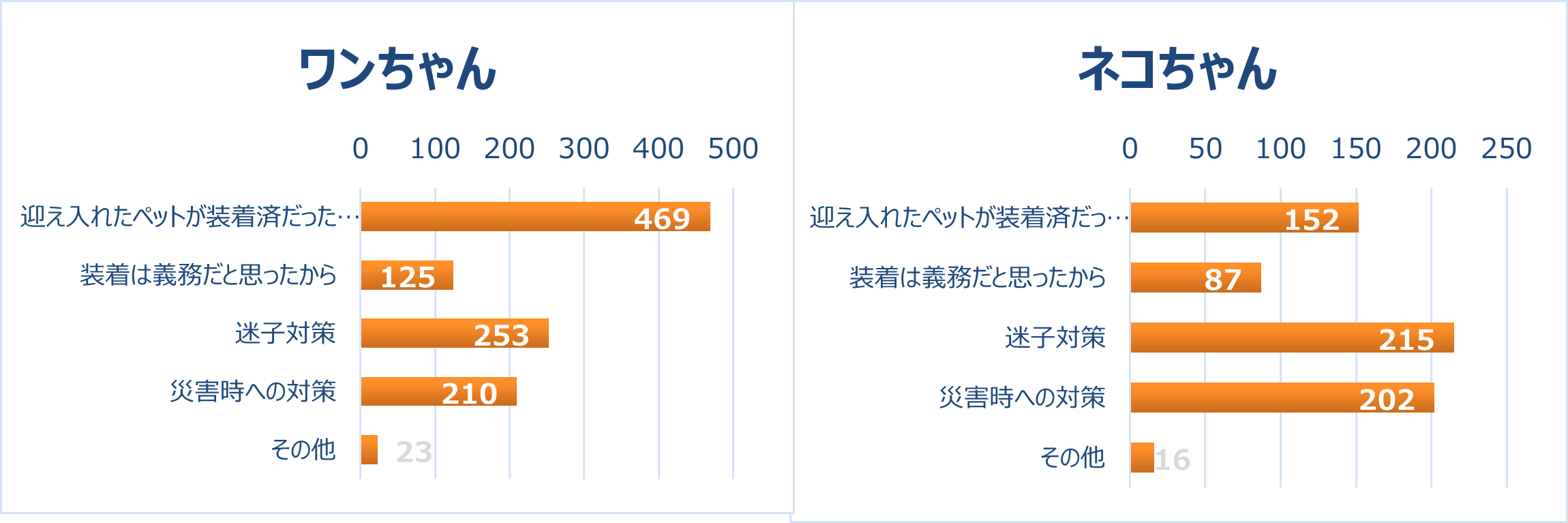犬は猫に比べ、ペットショップやブリーダーからの購入が多いため、「迎え入れたペットが装着済だったから」の回答が多い可能性。