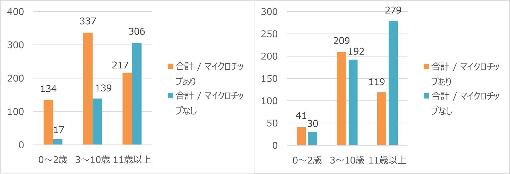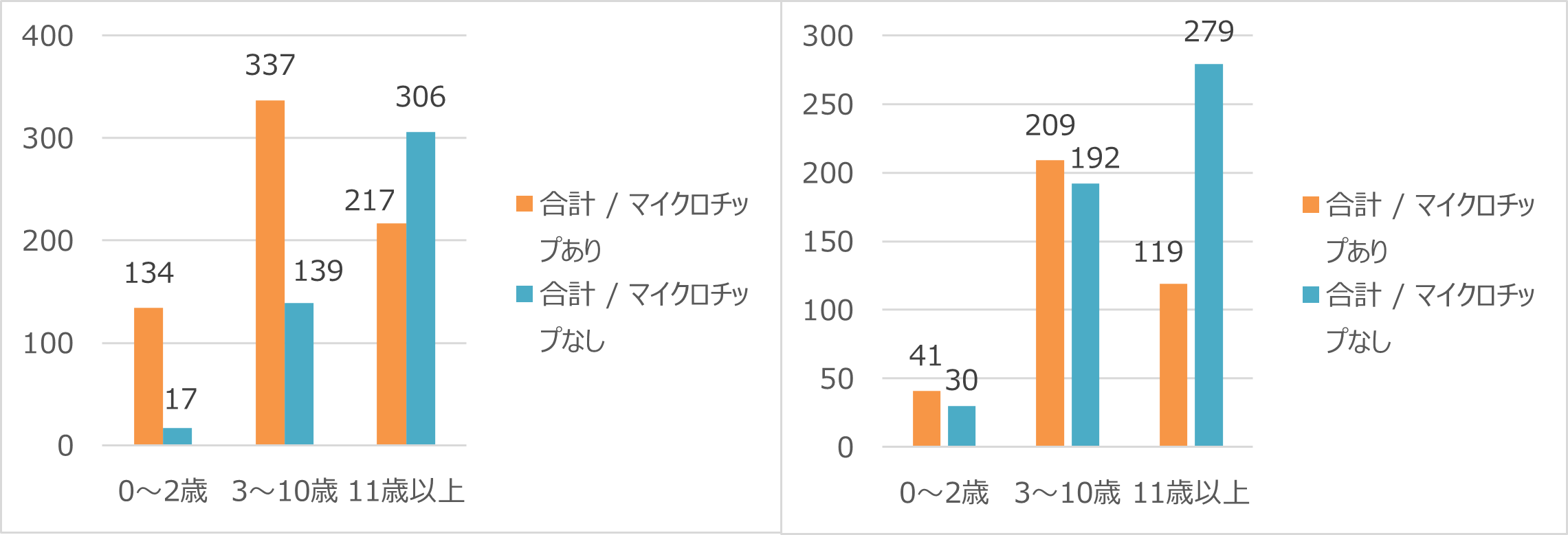 犬・猫ともに11歳以上のマイクロチップの装着割合が低い。