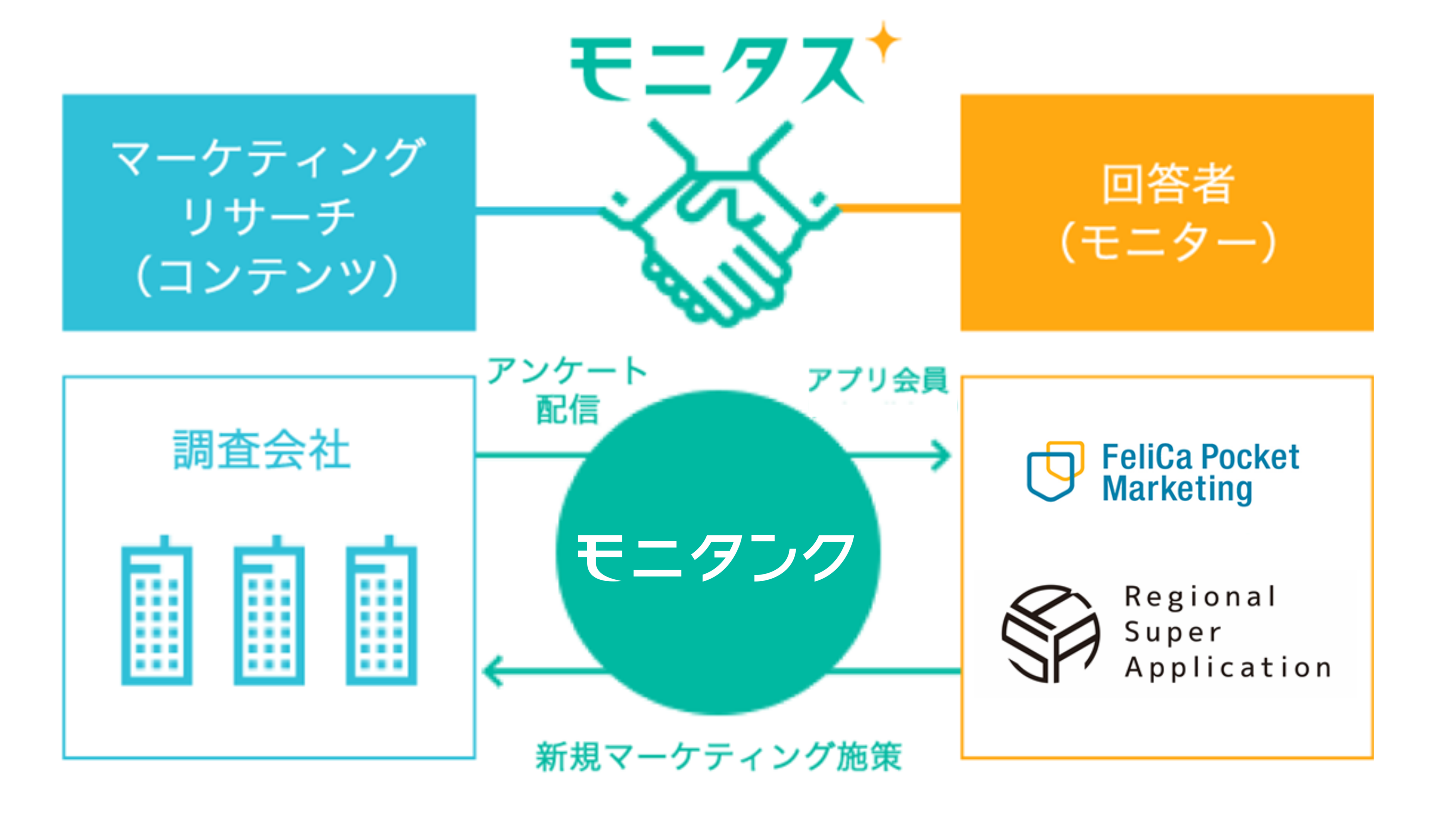 株式会社モニタス(本社:東京都港区、代表取締役社長:林 秀紀、以下 モニタス)は、フェリカポケットマーケティング株式会社(本社:東京都港区、代表取締役社長:納村 哲二、以下 フェリカポケットマーケティング)が各地に展開している「リージョナルスーパーアプリ(RSA)」と、モニタスが提供するアンケートモニターサービス『モニタンク』が連携を致しましたことをご報告いたします。本連携により、RSAアプリの利用者に対して、アンケート回答時にポイント(アプリ内ポイント)が付与されるサービスが提供可能になります。