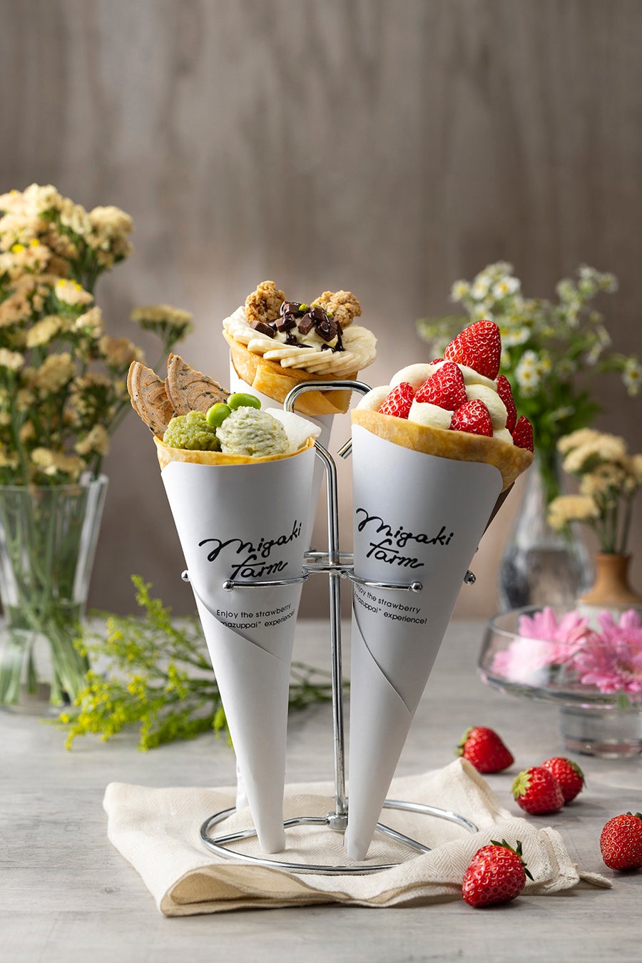 本店舗は、「花を束ねるように、おいしさを包み込む」をコンセプトに、旬の果物や地元食材を美しく包み込んだクレープと、こだわりのドリンクを提供します。自社農場で育てたいちごをはじめ、素材の魅力を“花束”のように美しく、そして美味しく仕上げました。