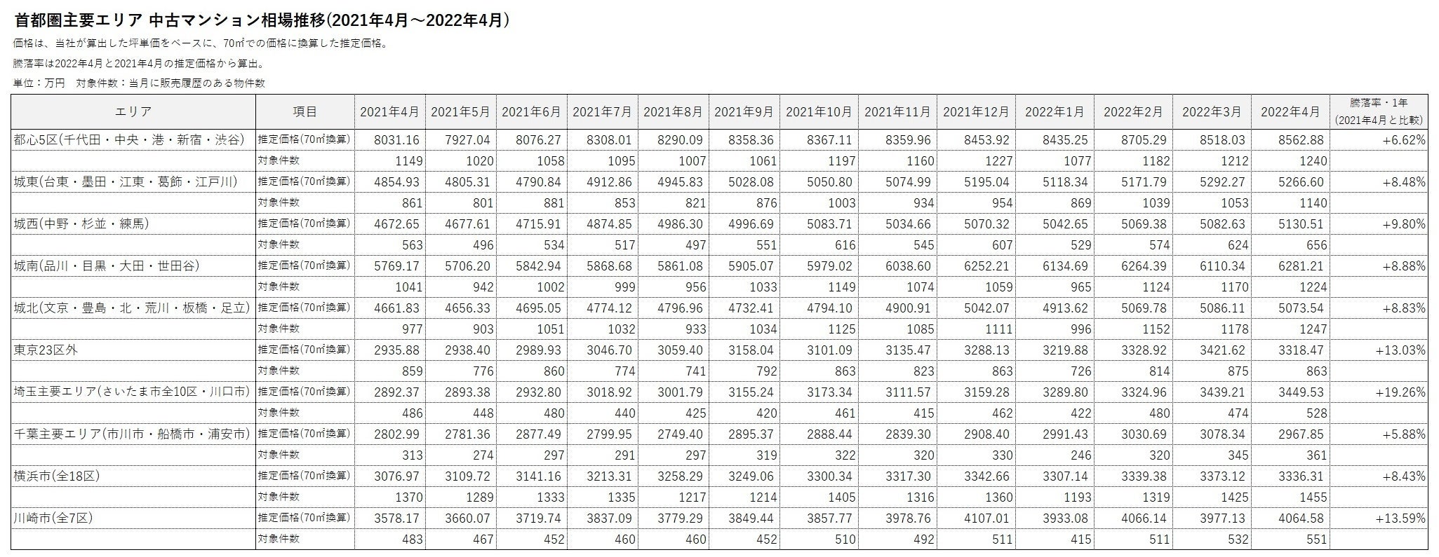 ・前年(2021年4月)の価格と比較した騰落率は、全エリアでプラス。騰落率トップは「埼玉主要エリア」で+19.26%。次いで「川崎市」+13.59%、「東京23区外」+13.03%。