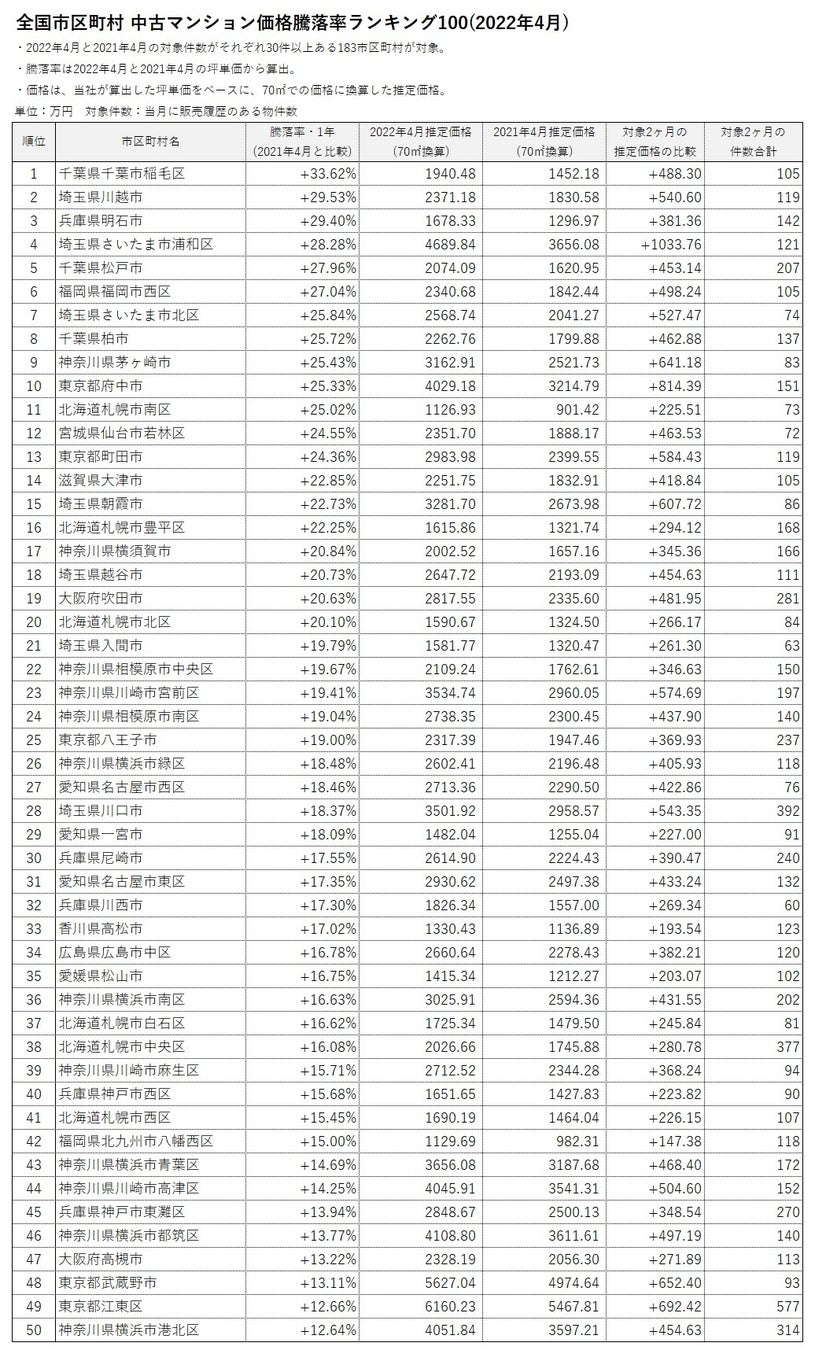 「マンションレビュー」2022年4月 全国市区町村 中古マンション価格/騰落率ランキング100