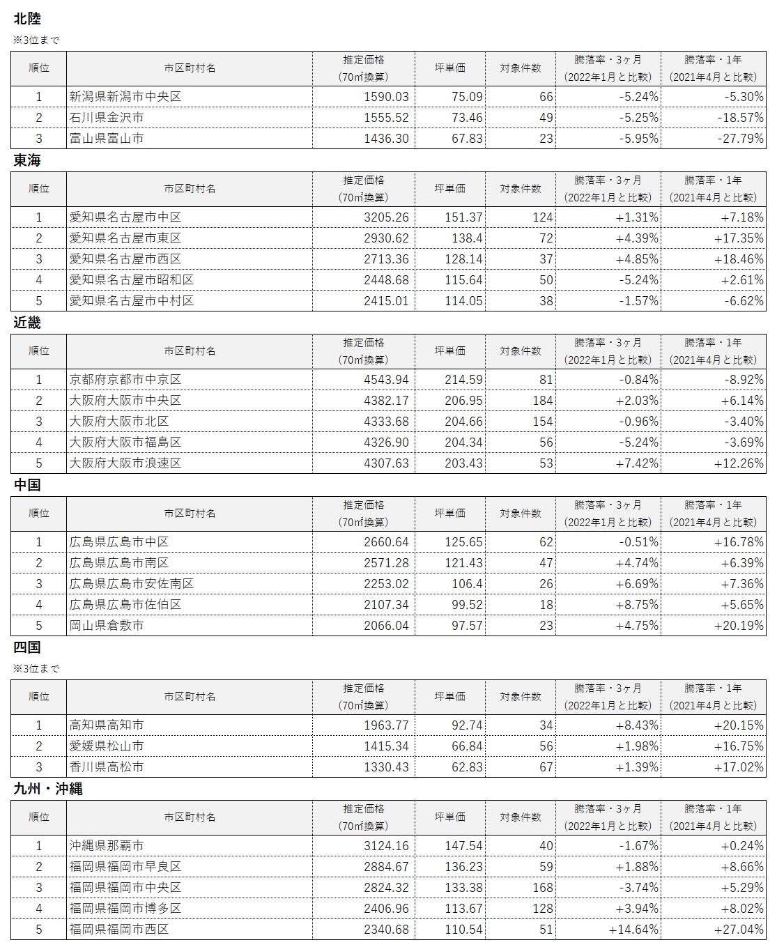 ・各エリアでの2022年4月の推定価格が1位の市区町村は以下の通り。