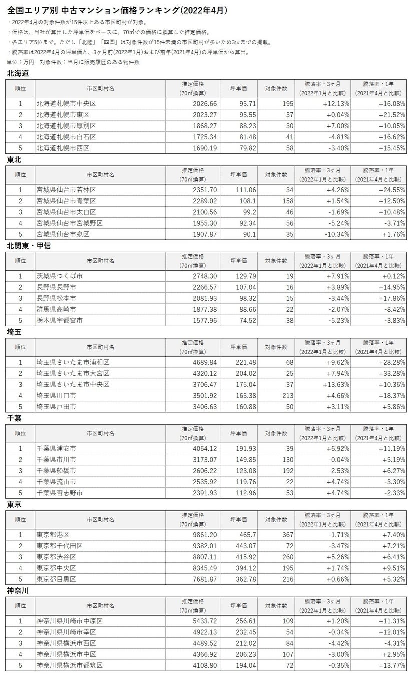 ■全国エリア別 中古マンション価格ランキング(2022年4月)