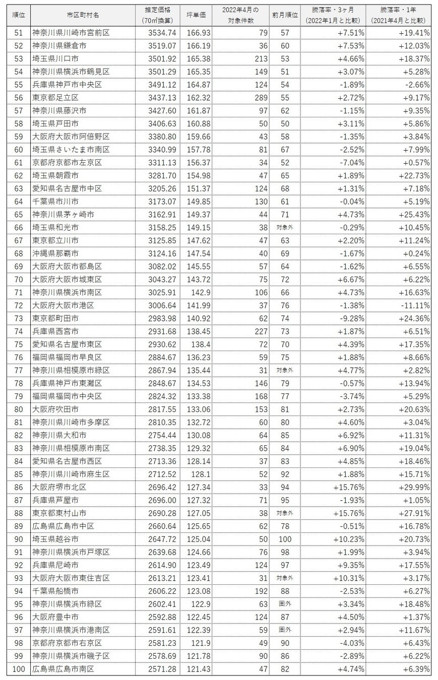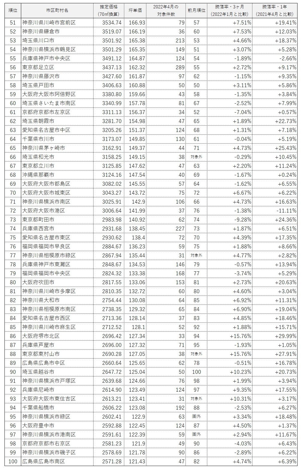 当社が保有する中古マンションの販売履歴データを元に「坪単価」を算出し、70㎡での価格に換算した「推定価格」によるランキング。2022年4月の対象件数(当月に販売履歴のある物件数)が30件以上ある全国217市区から、トップ100を掲載。