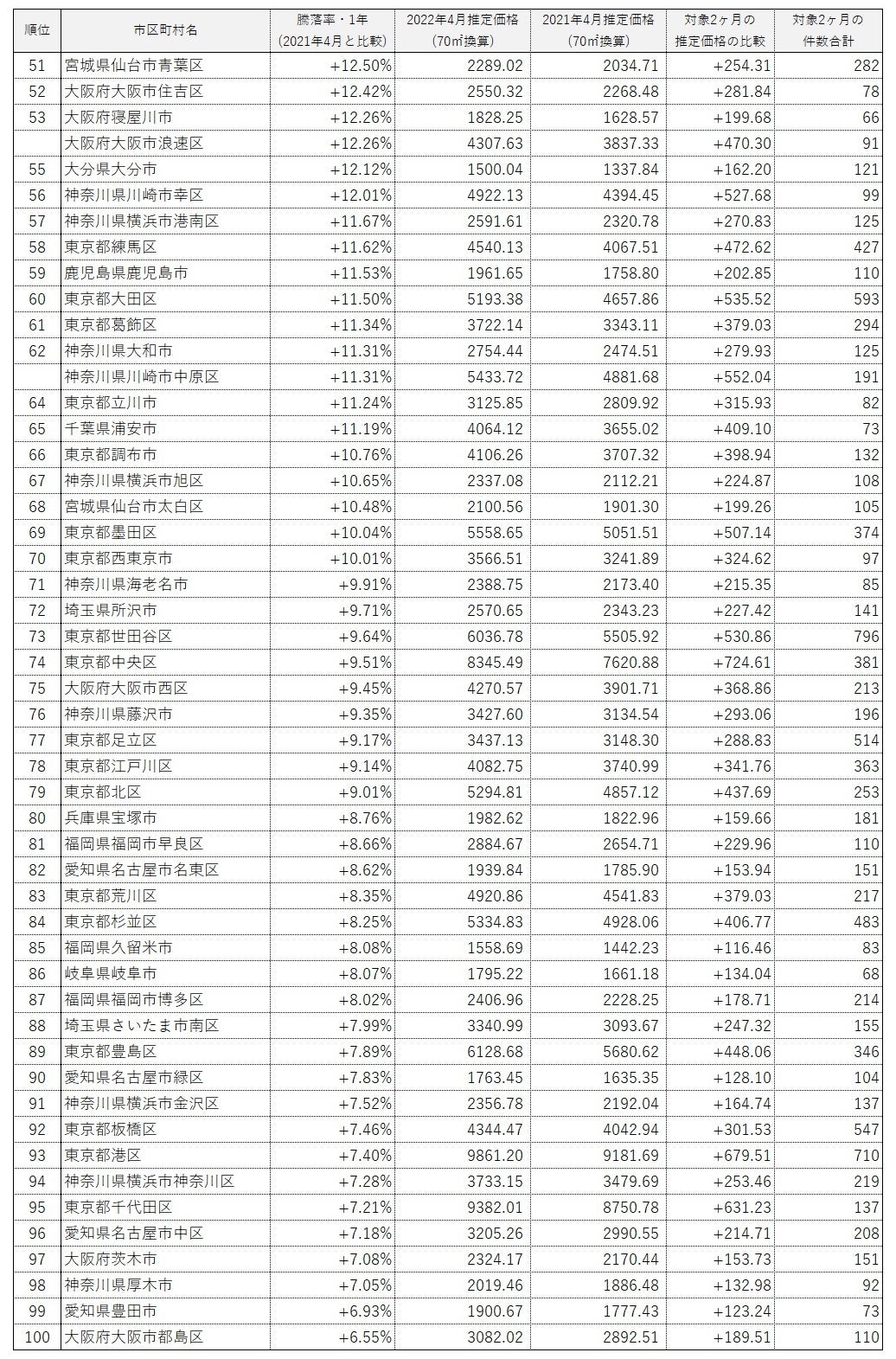 ・推定価格が100位以内の市区で、前年(2021年4月)と比較して価格が上昇したのは94市区。また、3ヶ月前(2022年1月)と比較して価格が上昇したのは65市区。
