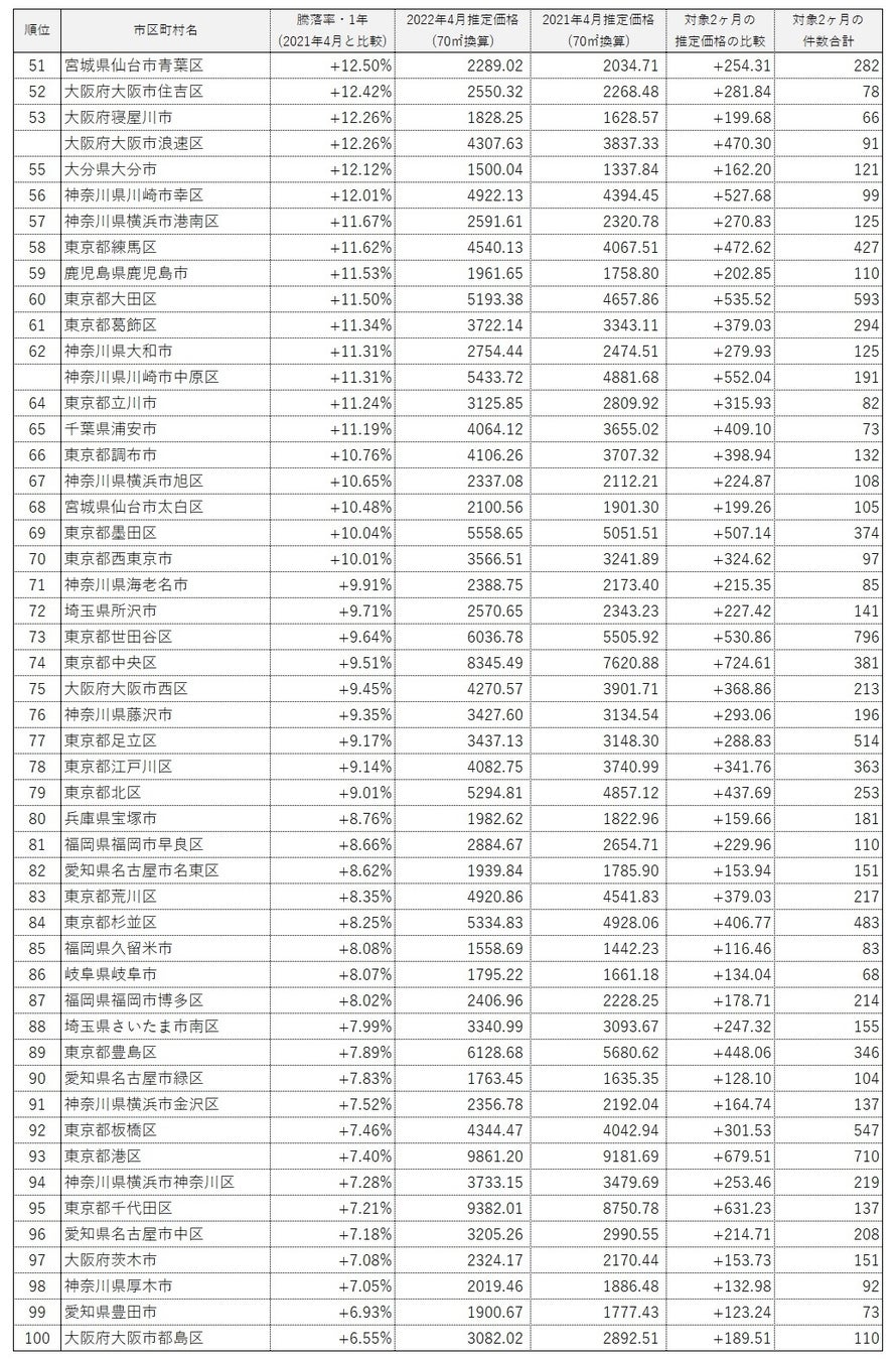 ・100位以内の市区で、前年(2021年4月)と比較して価格が上昇したのは94区。また、3ヶ月前(2022年1月)と比較して価格が上昇したのは65市区。