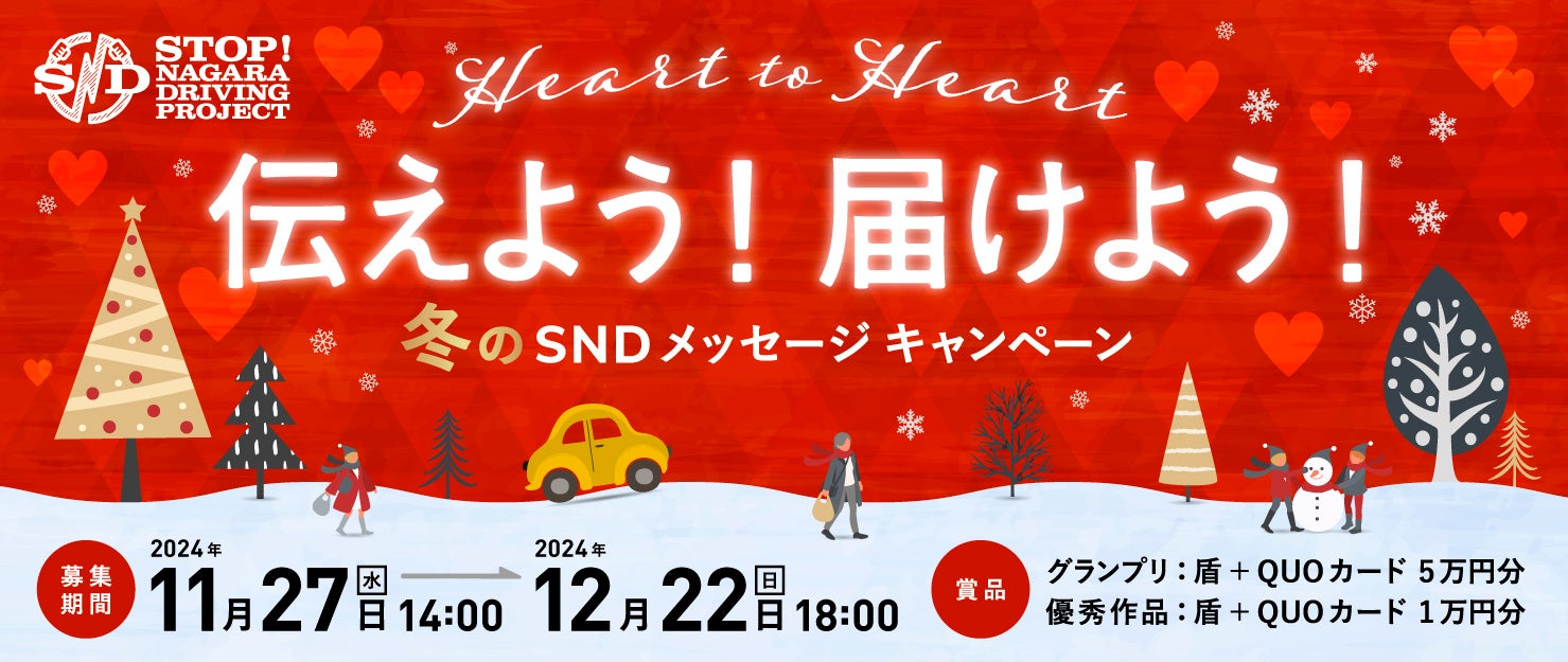 SNDプロジェクトでは、11月27日(水)~12月22日(日)の期間中、 「Heart to Heart 伝えよう!届けよう! 冬のSNDメッセージキャンペーン」を開催! ちょっとした気の緩みや身勝手な考えでおこりうる「ながら運転」をしない・させないをテーマに「ながら運転」に対する撲滅メッセージ を募集します。
