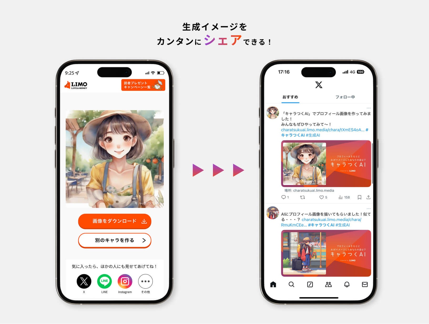 画像生成時に、共有用ページが個別に生成されるので、SNSで簡単にシェアして楽しめます。ご自身と似ているところやお気に入りポイントなどを、ひと言添えるのもおすすめです。