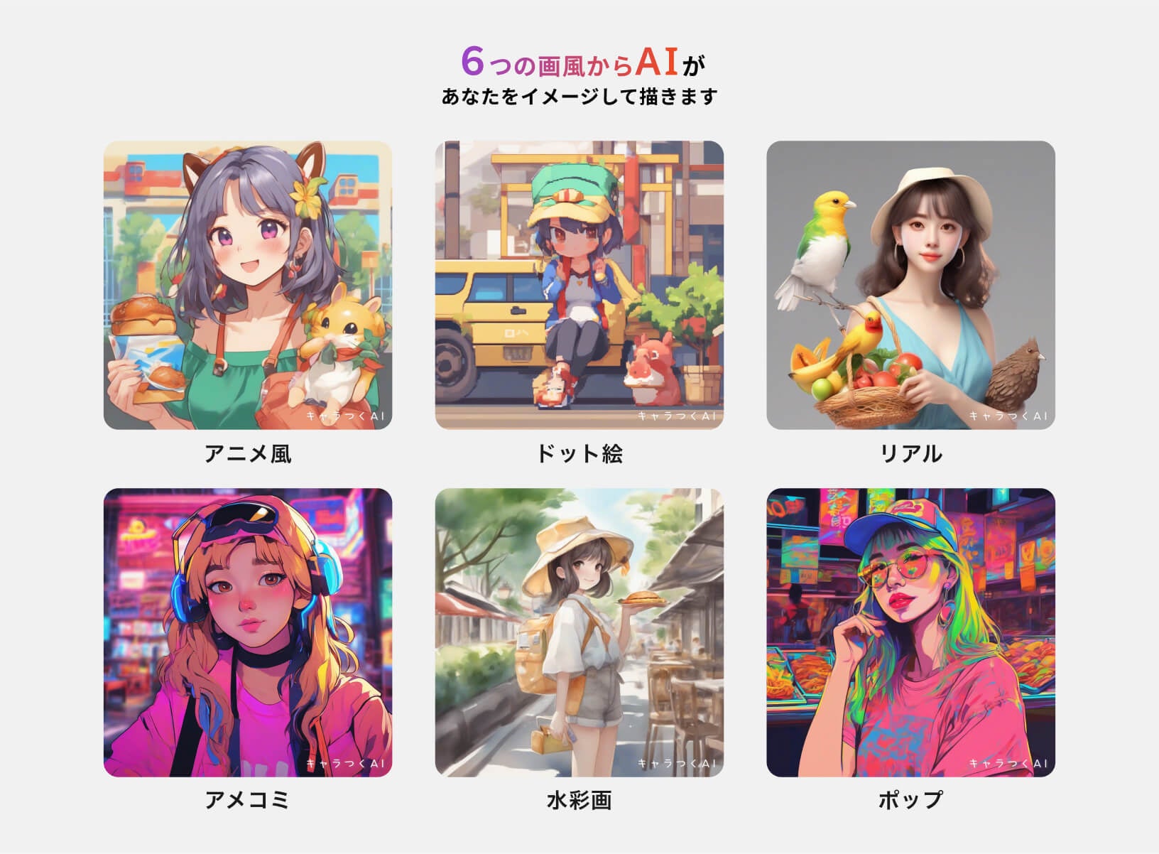 担当者が最もこだわったのは、AIのプロンプト作成です。「アニメ風」「ドット絵」「リアル」「アメコミ」「水彩画」「ポップ」の6パターンの画風ごとに、色やライティングのテイストを細かく調整し、それぞれのトーンの違いを実現しました。例えば、同じプロフィールで画風を変えれば、6パターンのイメージを楽しめます。好きな絵をSNSのアイコンにするなどして、お楽しみください。
