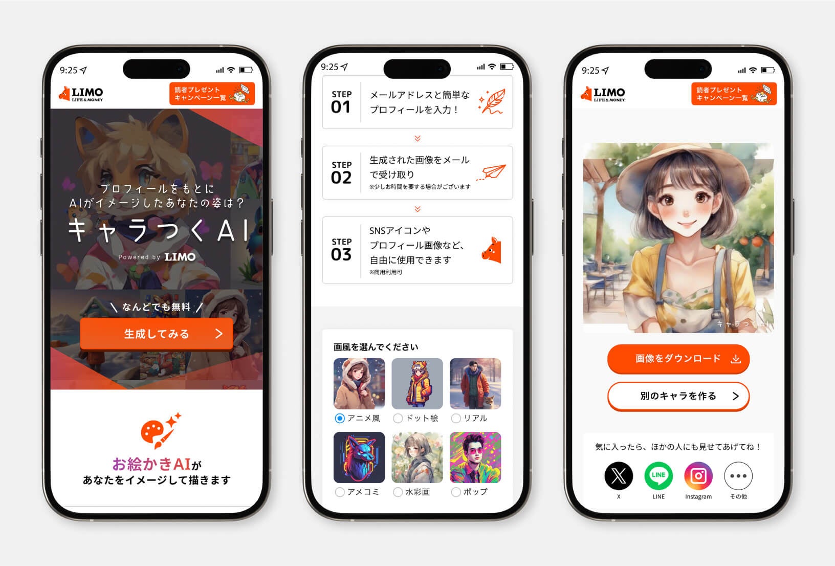 「アニメ風」「ドット絵」「リアル」「アメコミ」「水彩画」「ポップ」の6パターンの画風から好みのトーンを選び、簡単なアンケートに答えるだけで、生成AIが「あなたをイメージしたプロフィール画像」を作成します。画像はSNSアイコンやプロフィール画像などに自由に使用いただけます。画像は無料で何度でも生成できるので、6パターンすべてを試せます。今後も当社は、『LIMO』を通じて、わかりやすく有益な情報をお届けしつつ、より喜んでいただける場を目指して邁進いたします。