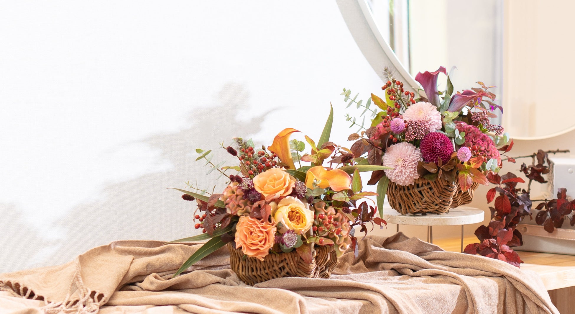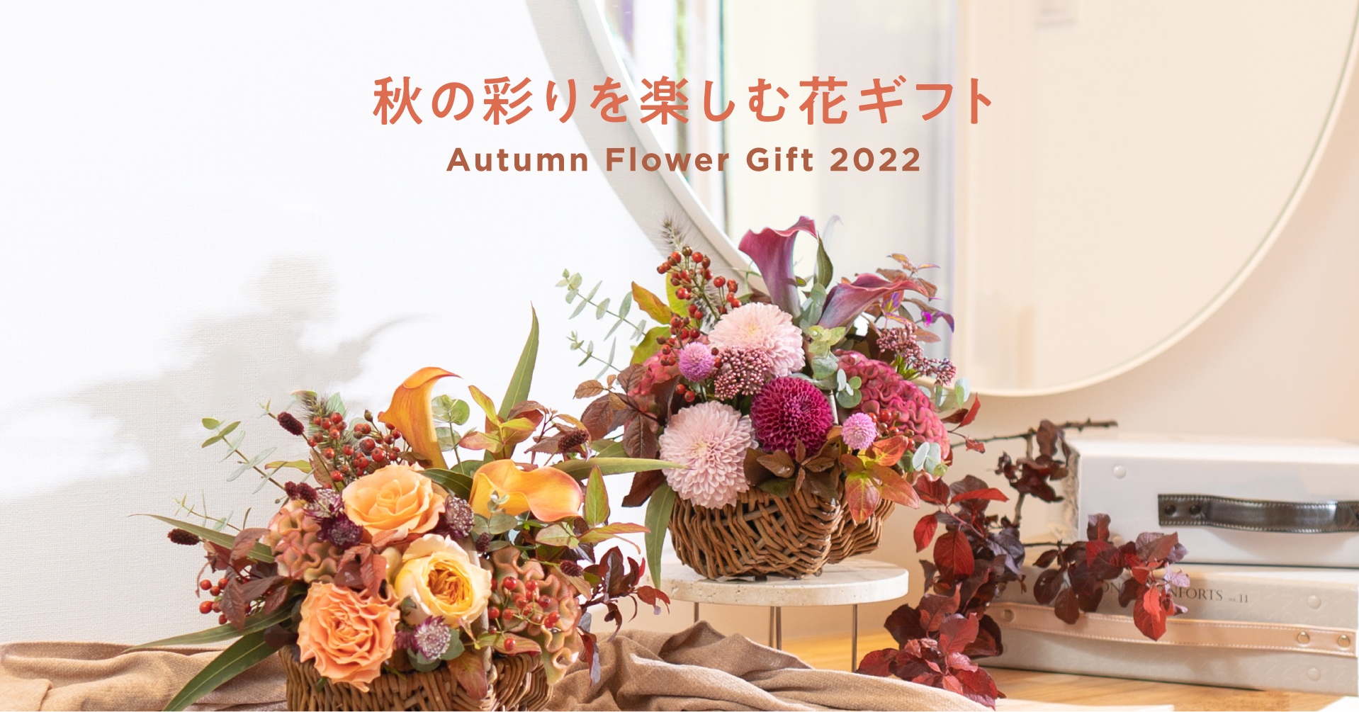 HitoHana(ひとはな)の秋の花ギフト。秋バラとマムを楽しむ花束とバスケット入りアレンジメントを限定販売