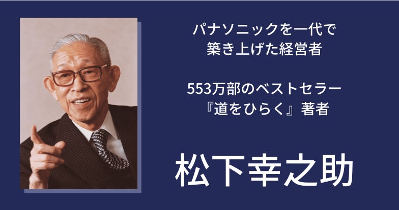 1894(明治27)年、和歌山県生まれ。9歳で小学校を中退、大阪に出て火鉢店、自転車店で奉公生活を送る。大阪市内を走る路面電車を見て、電気の将来性を感じ、1910(明治43)年、大阪電燈(現関西電力)に入社。1917(大正6)年、最年少の検査員になるものの、自ら考案したソケットを製造販売したいという思いなどから独立、翌18(大正7)年、松下電気器具製作所(のちの松下電器産業)を創業。高品質で安価な自転車用電池ランプ、電気アイロン等を開発し、成功を収める。その後、独自の経営理念と、それに基づく事業部制組織の採用、連盟店制度による販売システムの構築など斬新な経営手法によって、日本の家電産業を牽引、松下電器を一代で世界的企業へと築き上げた。その一方で、1946(昭和21)年、PHP研究所を創設。また21世紀を担う指導者の育成を目的に、1979(昭和54)年、松下政経塾を設立。『道をひらく』『実践経営哲学』等、著書多数。1989(平成元)年、94歳で没。