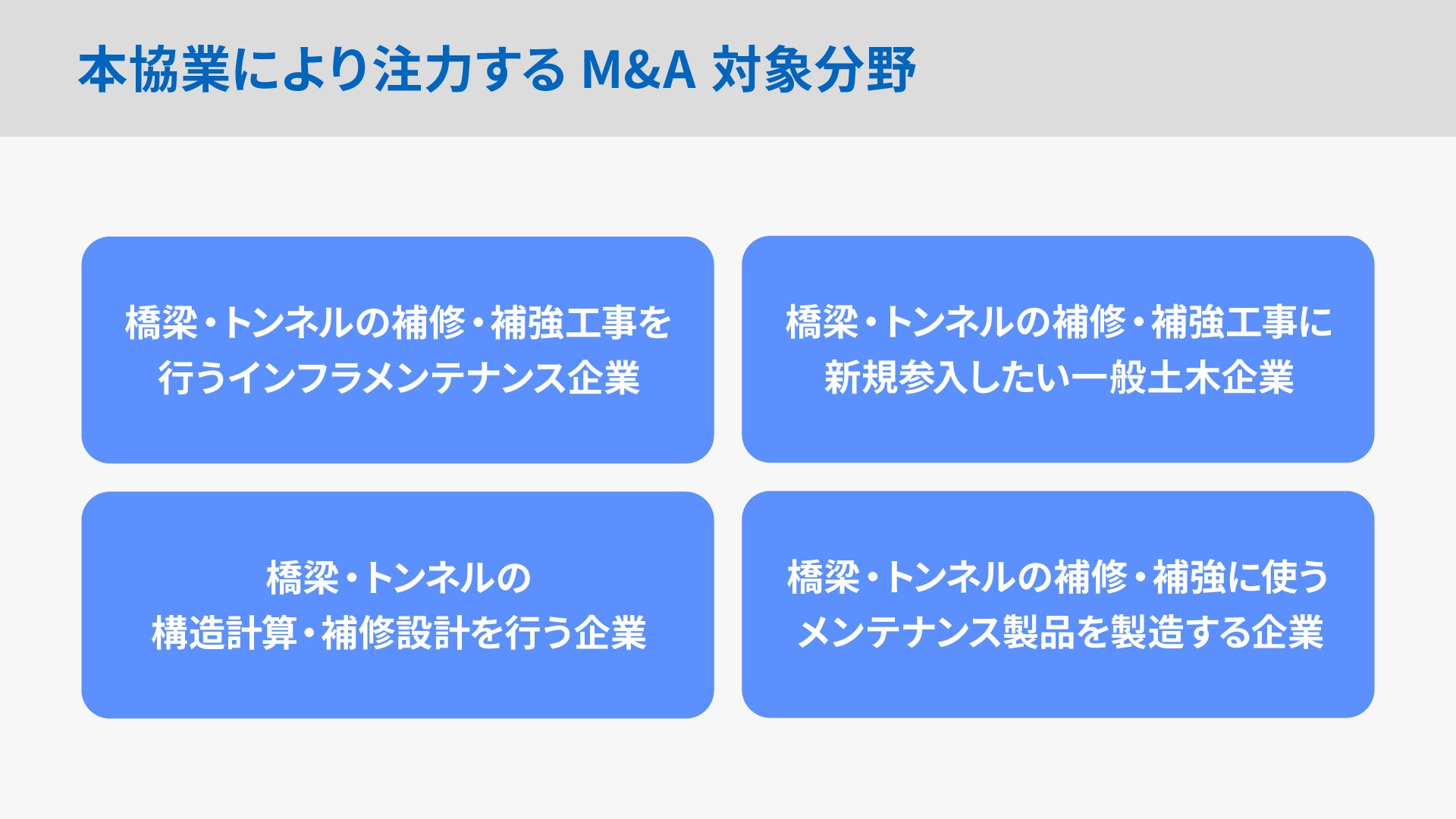 また、「インフラ守るくんM&Aグロース」では、「橋梁・トンネルの補修・補強工事企業」はもちろん、「同事業に新規参入したい企業」、「メンテナンス製品を製造する企業」、「構造計算・修正設計を行う企業」などもM&A対象としており、日本を代表する「橋梁・トンネルの補修・補強工事分野のグループ企業群」を目指して参ります。