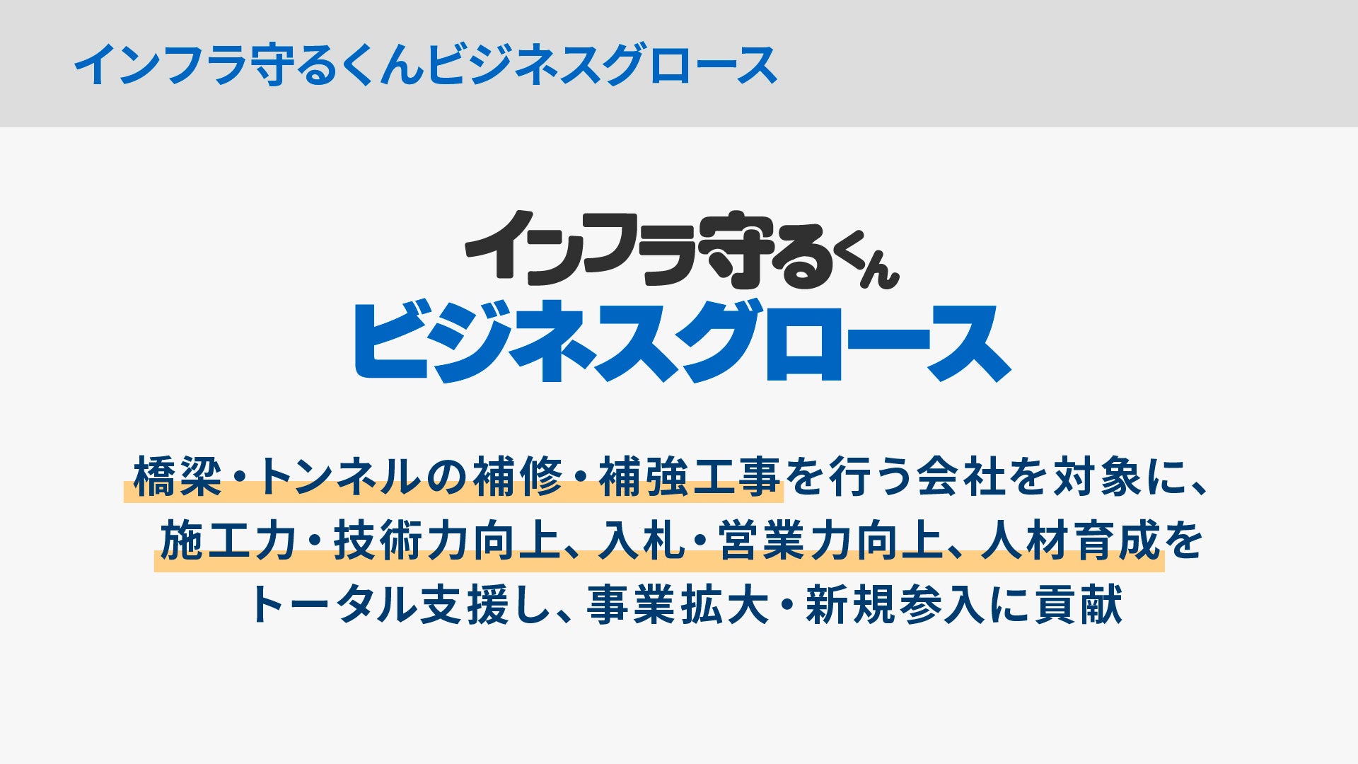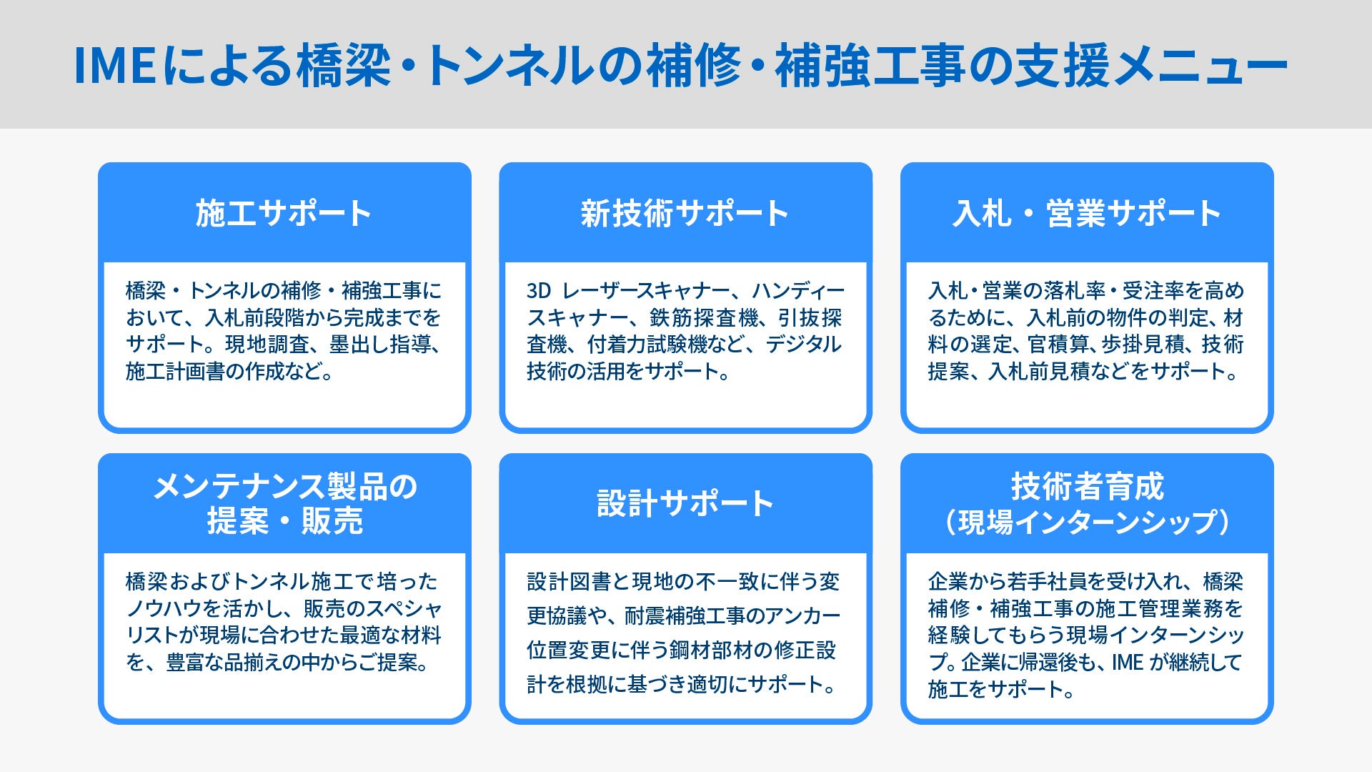 橋梁・トンネルの補修・補強工事企業の事業拡大・新規参入を支援する「インフラ守るくんビジネスグロース」を開始します。具体的には、IMEが「施工・技術サポート」、「入札・営業サポート」、「メンテナンス製品の提案・販売」、「設計サポート」、「技術者育成」など、橋梁・トンネルの補修・補強工事企業の課題解決をトータルで支援します。