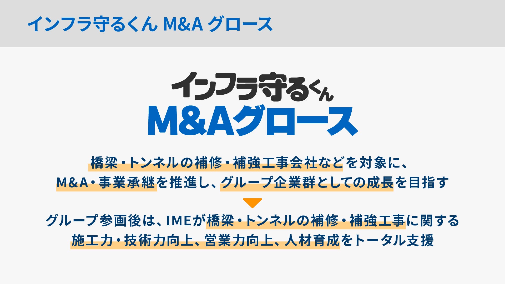 インフラメンテナンス企業のM&A・事業承継を推進し、グループ企業群としての成長を目指す「インフラ守るくんM&Aグロース」を開始します。具体的には、インフラテック・ジャパンがM&Aによりグループ化したインフラメンテナンス企業に対して、IMEが橋梁・トンネルの補修・補強工事に関する専門的な知見・ノウハウ・ネットワークを活かした支援を行い、事業拡大・業績向上に貢献します。