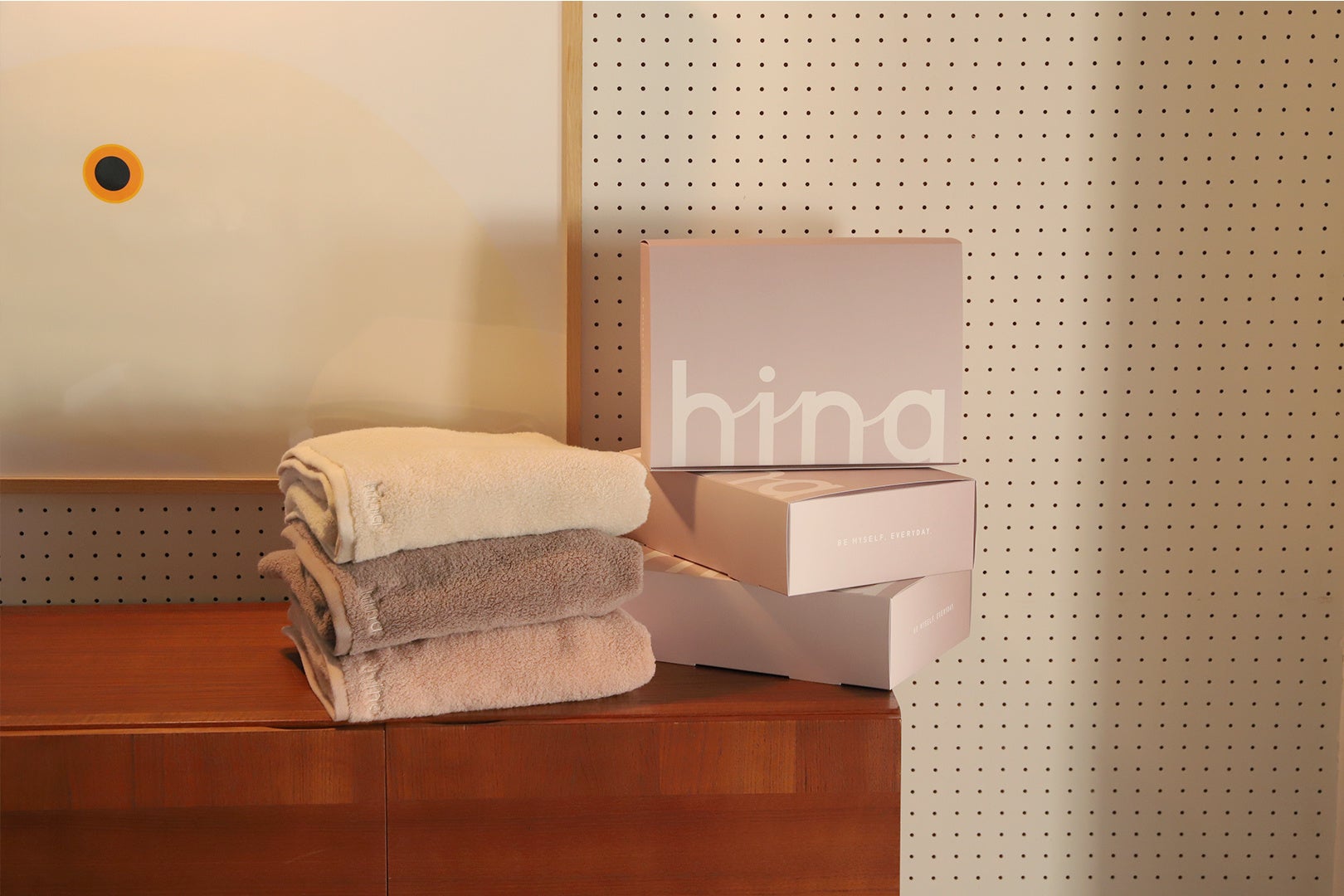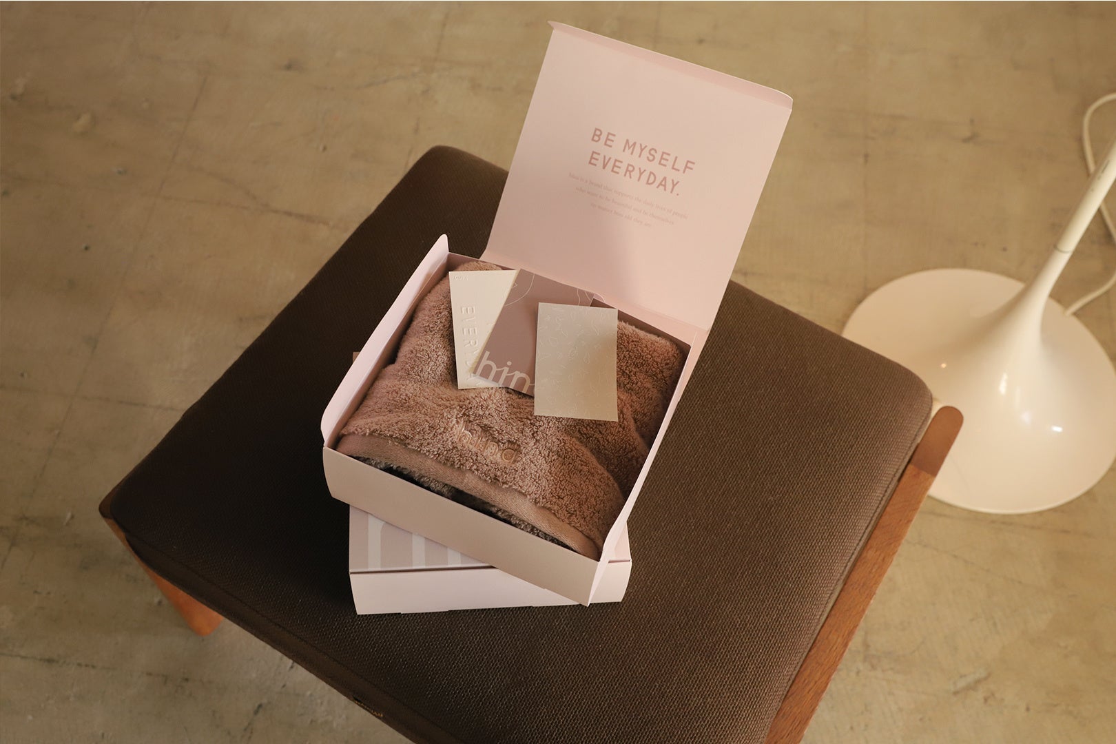大切な人へのギフトとしても選んでいただけるよう、そのままお渡ししても喜んでもらえるこだわりのBOXパッケージとなっております。hinaの世界観を表現したBOXの中には、ブランドからのメッセージに加えて、タオルの色に合わせたステッカーを同梱しております。