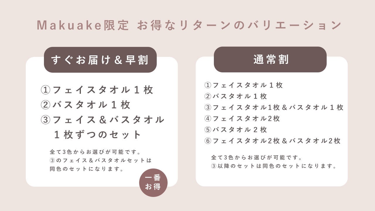 受注生産分のリターンになります。比較的在庫の融通が効くため、早割よりセットのバリエーションを多く用意させていただきました。毎日hinaのタオルを堪能したいという方のために、フェイスタオル2枚、バスタオル2枚の4枚セットもございます!