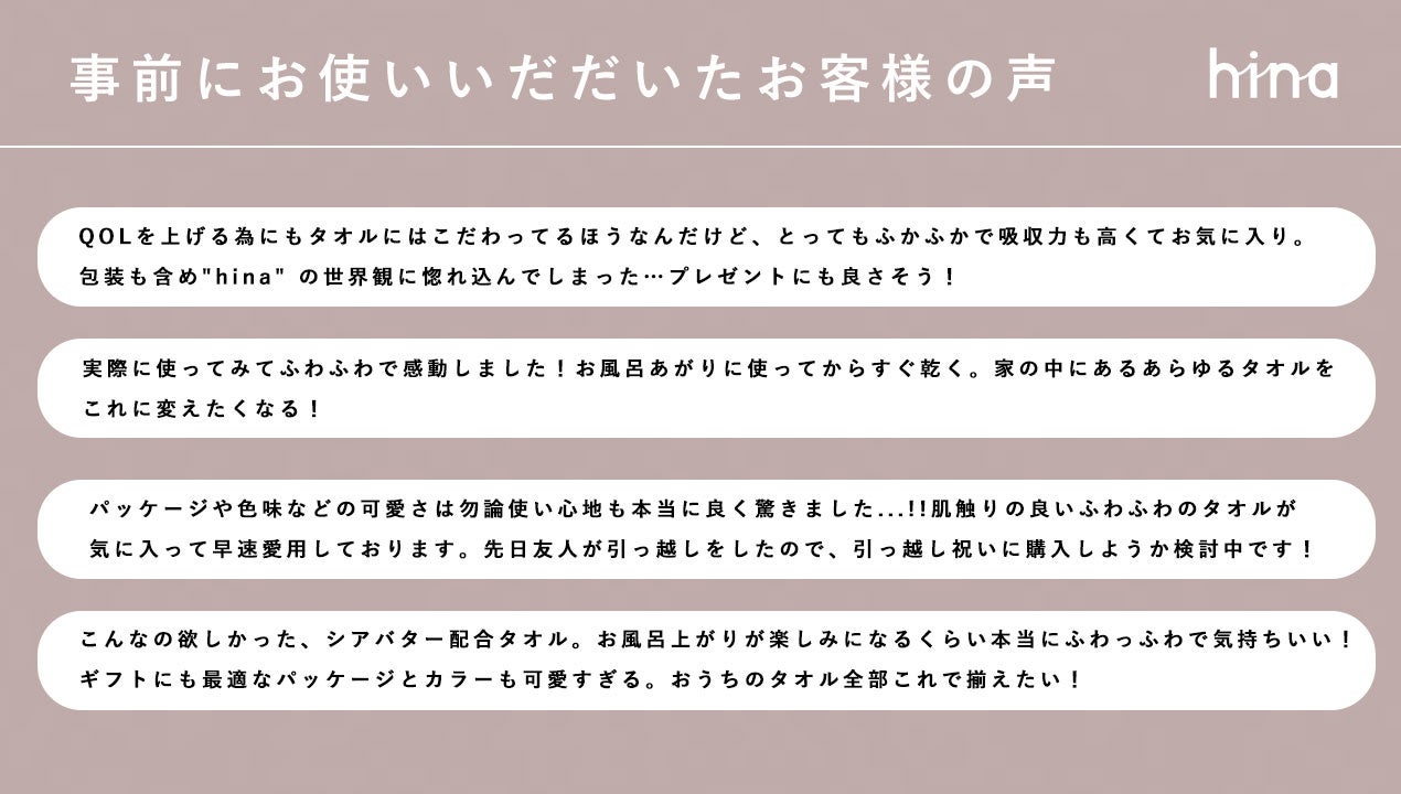 実際に事前モニターとしてhinaのタオルをご利用いただいた方々からも、素敵な感想をいただいておりますので一部掲載させていただきます。