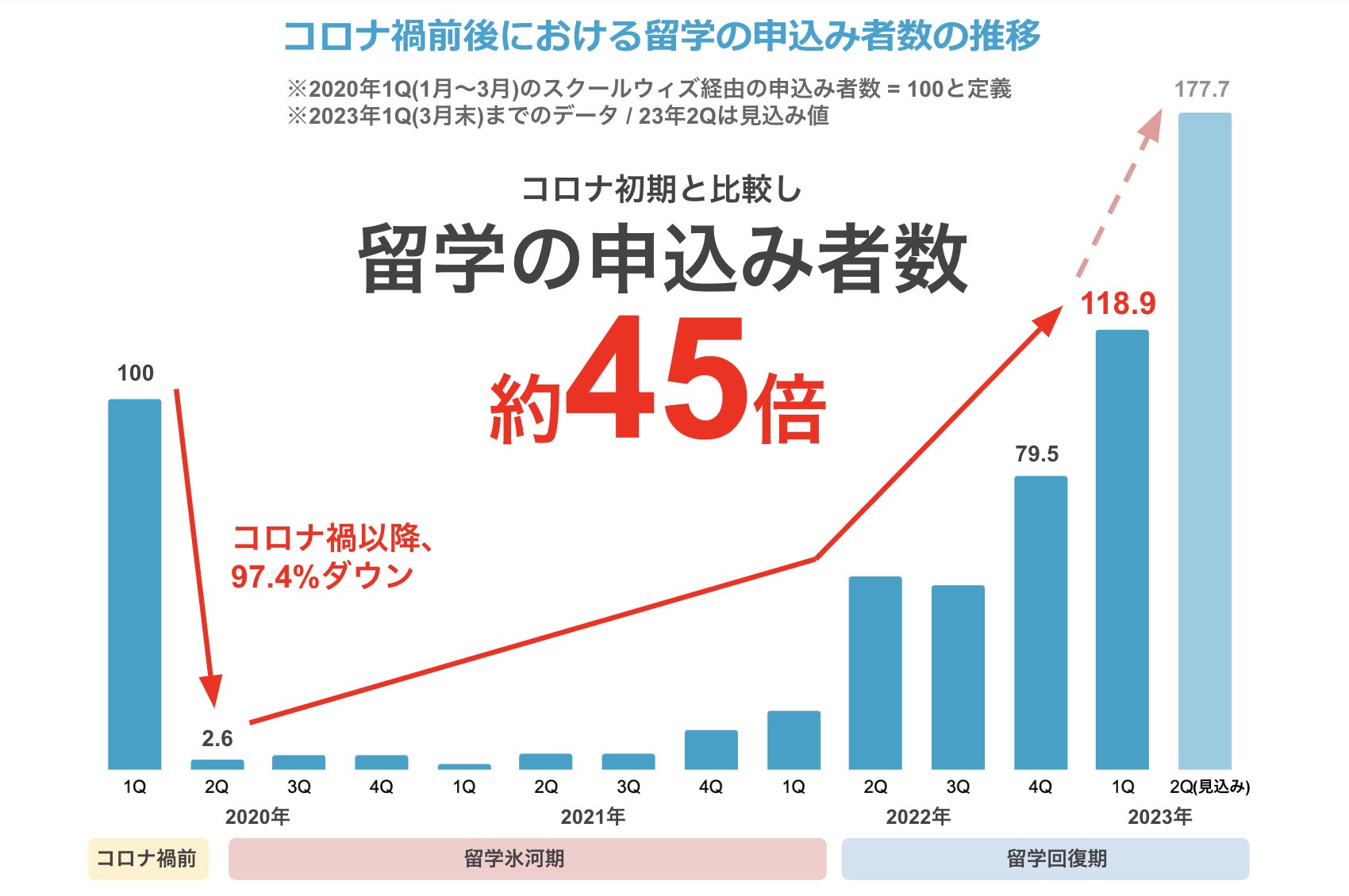 ・2023年現在、コロナ直後と比較し、約45倍の留学者数まで大きく成長を遂げる。コロナ前の好調時を上回る申込み者数となり、今後も増加傾向となる見込み(2023年4-6月にはコロナ直後と比較し、およそ68倍まで引き上がる見込み)