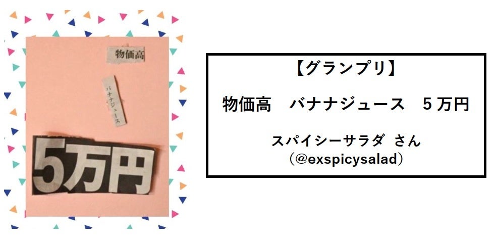 日本新聞協会は10月4日、新聞を切り抜いて作る「#親子でコラージュ川柳」コンテスト選考結果を発表しました。グランプリは「物価高 バナナジュース 5万円」(スパイシーサラダさん)。言葉の意外な組み合わせで世相をユーモラスに詠んだ一句です。