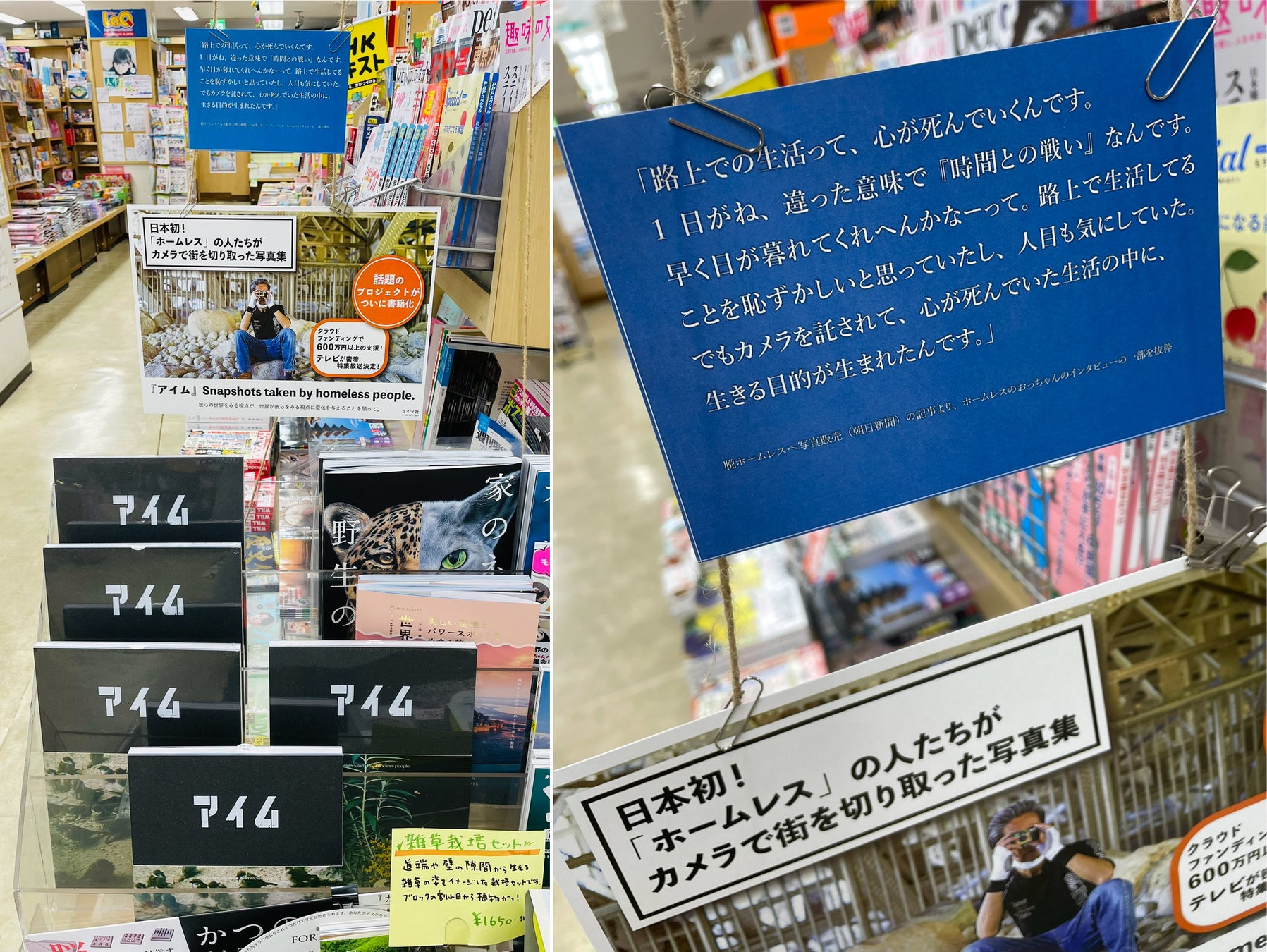 写真集『アイム Snapshots taken by homeless people.』は日本ではじめて、ホームレス状態の人たちが自分たちの街を撮影して制作されました。ホームレス支援の延長に写真集制作を行ったのは、いままでホームレス問題に関心のなかった層に届けたい、という思いからでした。さらに支援の輪を広げるため、写真集を置いていただける図書館や自治体施設、教育機関などを募集しています。ご協力をお願いします。