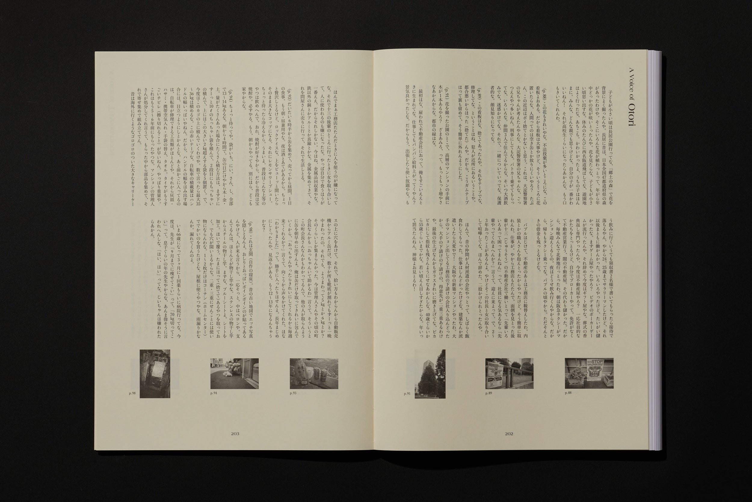 写真という作品を介しているからか、おだやかな口調でたくさんの「私」が語られていました。何度もインタビューと写真を往復しながら、それぞれの社会背景や生き方の選択に深く思いを巡らしました。写真という作品からのアプローチは、今までのホームレスといった一括り的な見方を、いとも軽やかに変えてくれるものだと確信しています。