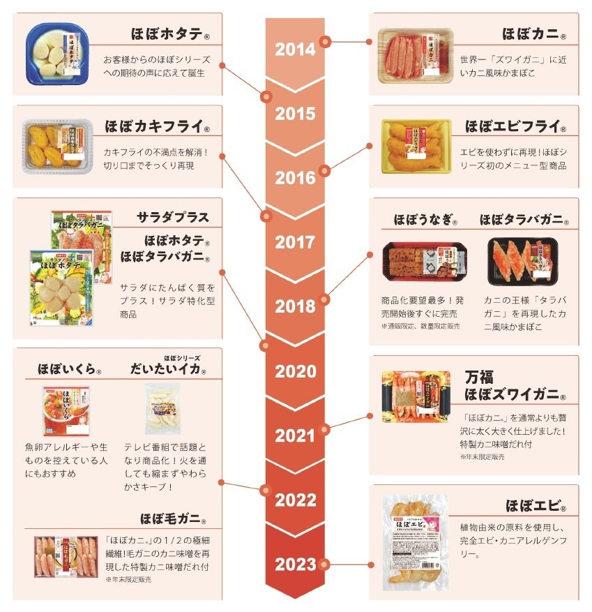 開発がスタートした2012年、ズワイガニが価格高騰により手が届きにくい食材になっていたこと等、食のお困りごとを少しでも解決したいという想いから、「世界一ズワイガニに近いカニ風味かまぼこ」を開発しました。