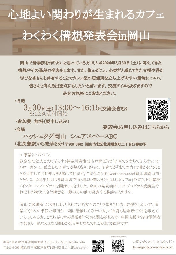 こまちぷらすはcotocoto.coto(岡山県岡山市)とともに、2023年12月より岡山県で「心地よい関わりが生まれるカフェ」の立ち上げ講座・インターンプログラムを開講してきました。「心地よい関わりが生まれるカフェ」の立ち上げ講座・インターンプログラムは、飲食を伴う関わりが生まれる居場所(以下カフェ)の立ち上げ方を学んだり実務体験ができるだけでなく、地域で居場所づくりをしたい人とそれを応援する人とをつなげていくことが特徴です。