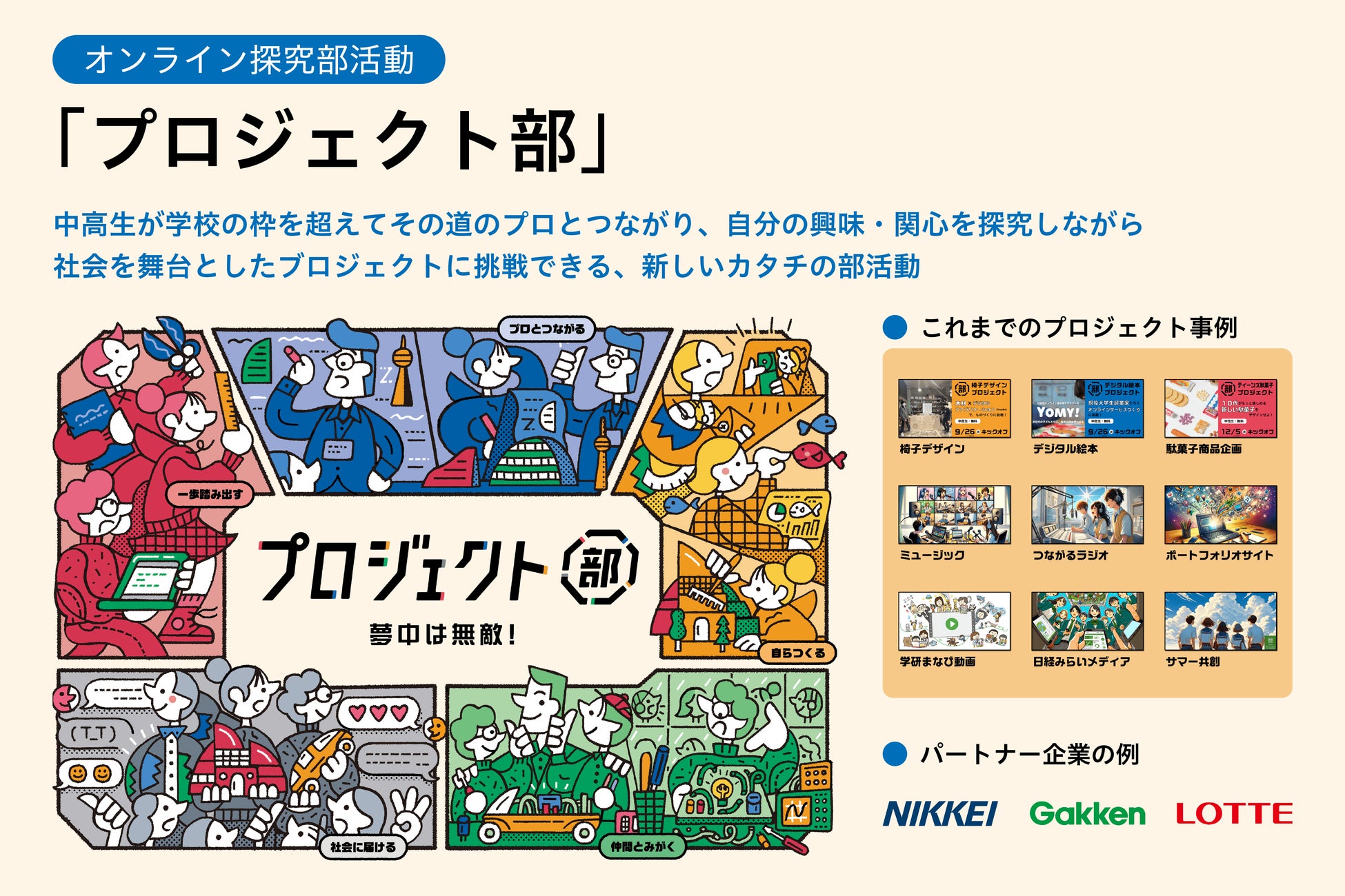 中高生がオンラインで全国の仲間とつながり、自分の興味関心をとことん探究できる、新しいカタチの部活動です。建築・音楽・ラジオ・絵本・動画・フードなど、さまざまなテーマでのプロジェクトに加え、日経新聞・学研・ロッテなどとの共創プロジェクトも多数展開しています。活動は全国規模で行われており、2025年3月時点で200名を超える部員が所属しています。学校単位・自治体単位での公式導入により、校内の探究学習の取り組みをより一層推進することが可能です。