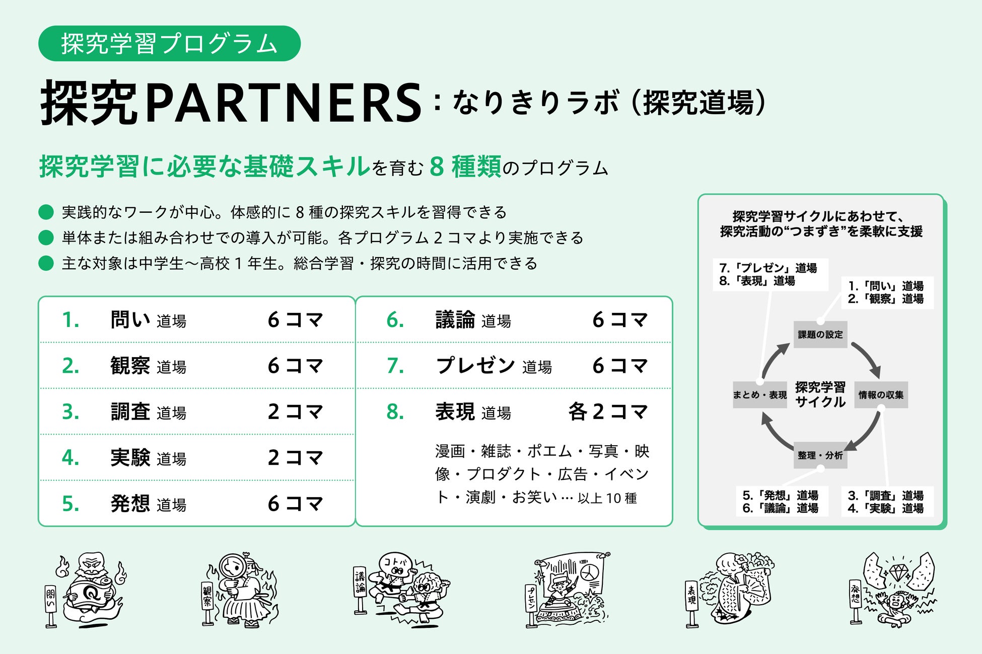 「仕事」を切り口に、探究スキルや非認知能力の育成を実現する探究学習プログラムシリーズ「なりきりラボ」を学校向けに提供します。その中でも「探究道場」は、「問い」「観察」「発想」「議論」「表現」など、探究に必要な8つの基本スキルを体系的に学べるプログラムです。