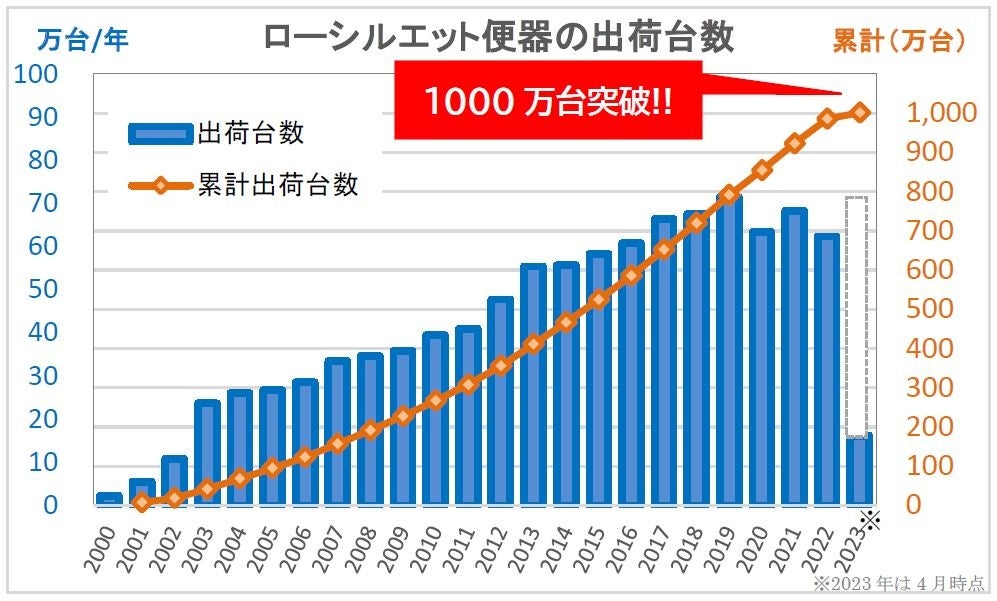 一般社団法人日本レストルーム工業会(本部:愛知県名古屋市 会長:清田 徳明(TOTO㈱))で大便器の出荷台数調査を実施した結果、ローシルエット便器 (※1) の2000年以来の累計出荷台数が、1,000万台を突破しました。(2023年4月時点)