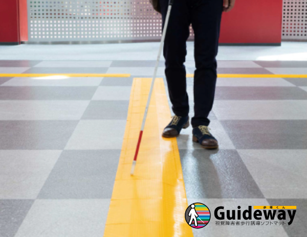 ※同展示会では、2015年の発売以来、公共施設・病院・オフィスビルなど国内でシリーズ累計1000か所以上(※)に導入されているゴム製の視覚障害者歩行誘導マット『歩導くんガイドウェイ』(屋内専用)も展示される。