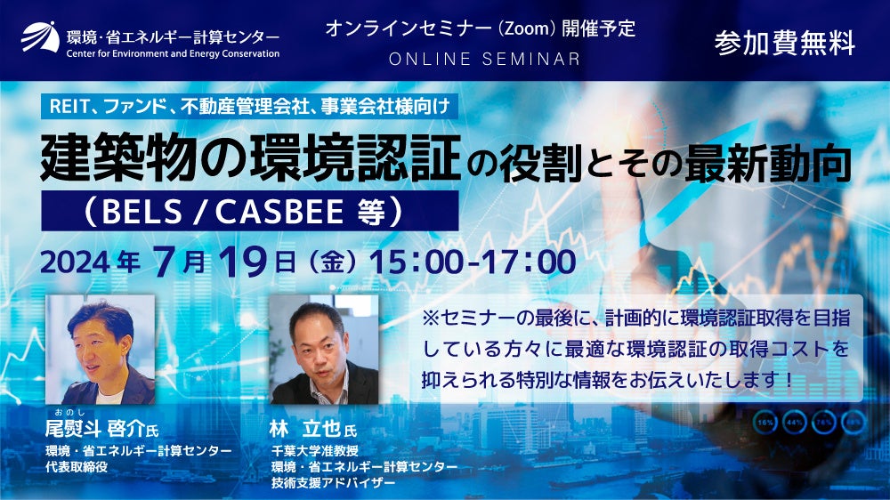 建築物の省エネ計算事業を手掛ける、環境・省エネルギー計算センター(本社:東京都豊島区、代表取締役:尾熨斗啓介、運営会社:株式会社HorizonXX)は、2024年7月19日(金)、REITや不動産ファンド、不動産管理会社、事業会社などを対象に、『建築物の環境認証(BELS、CASBEE等)の役割とその最新動向』をテーマとしたオンラインセミナーを開催いたします。