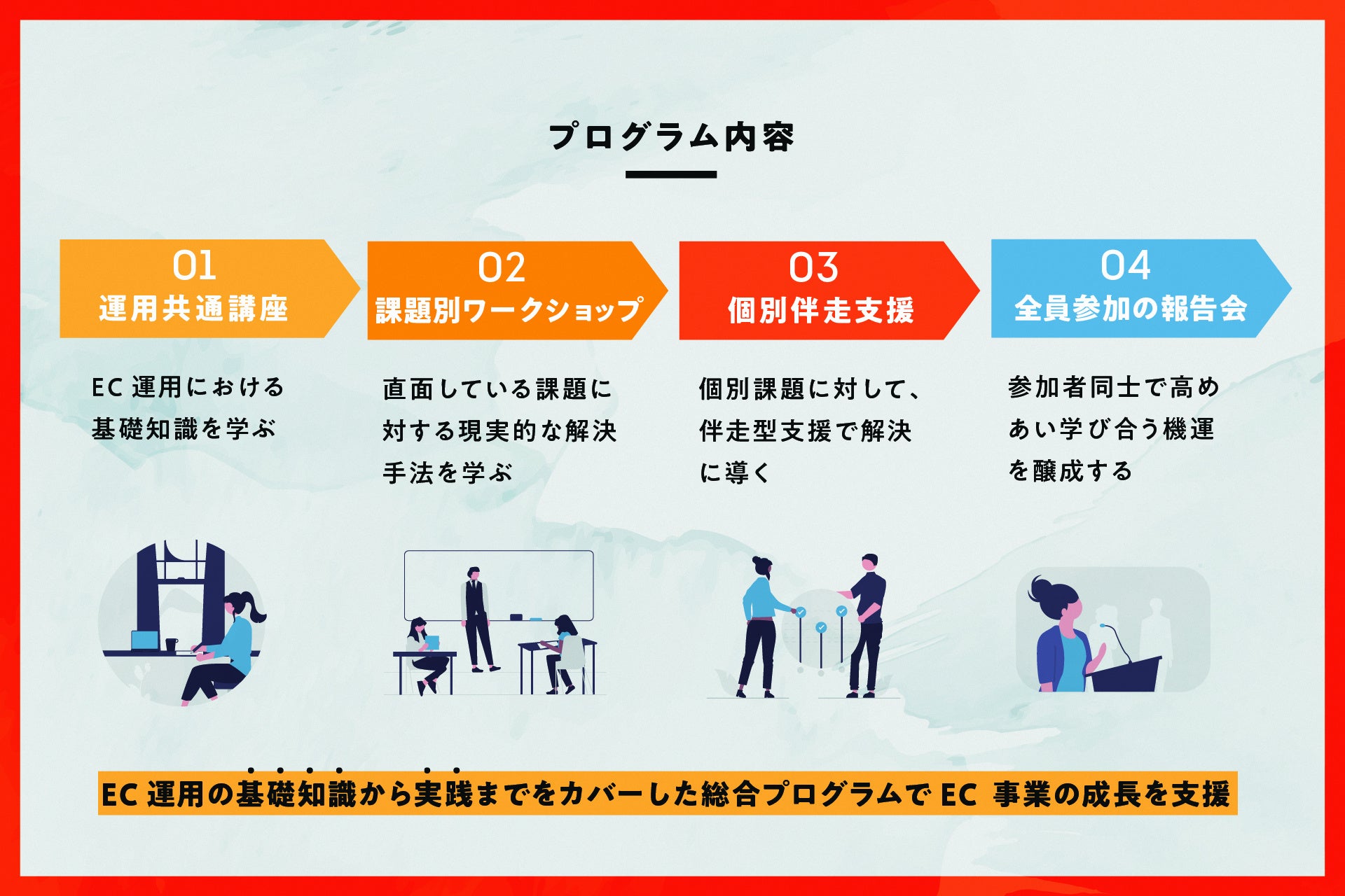 今回、基礎講座を通して集まった事業者から共通課題を抽出し、EC運用の基礎知識から実践までをカバーする講座とワークショップを展開します。さらに、EC運営上の個別の事業者の課題を解決し、事業成長を促進するために、個別の事業者ごとにプロデューサーとコンサルタントが伴走する仕組みを取り入れ、地域の事業者が主体をもって課題を解決していくことを継続的にサポートしていきます。