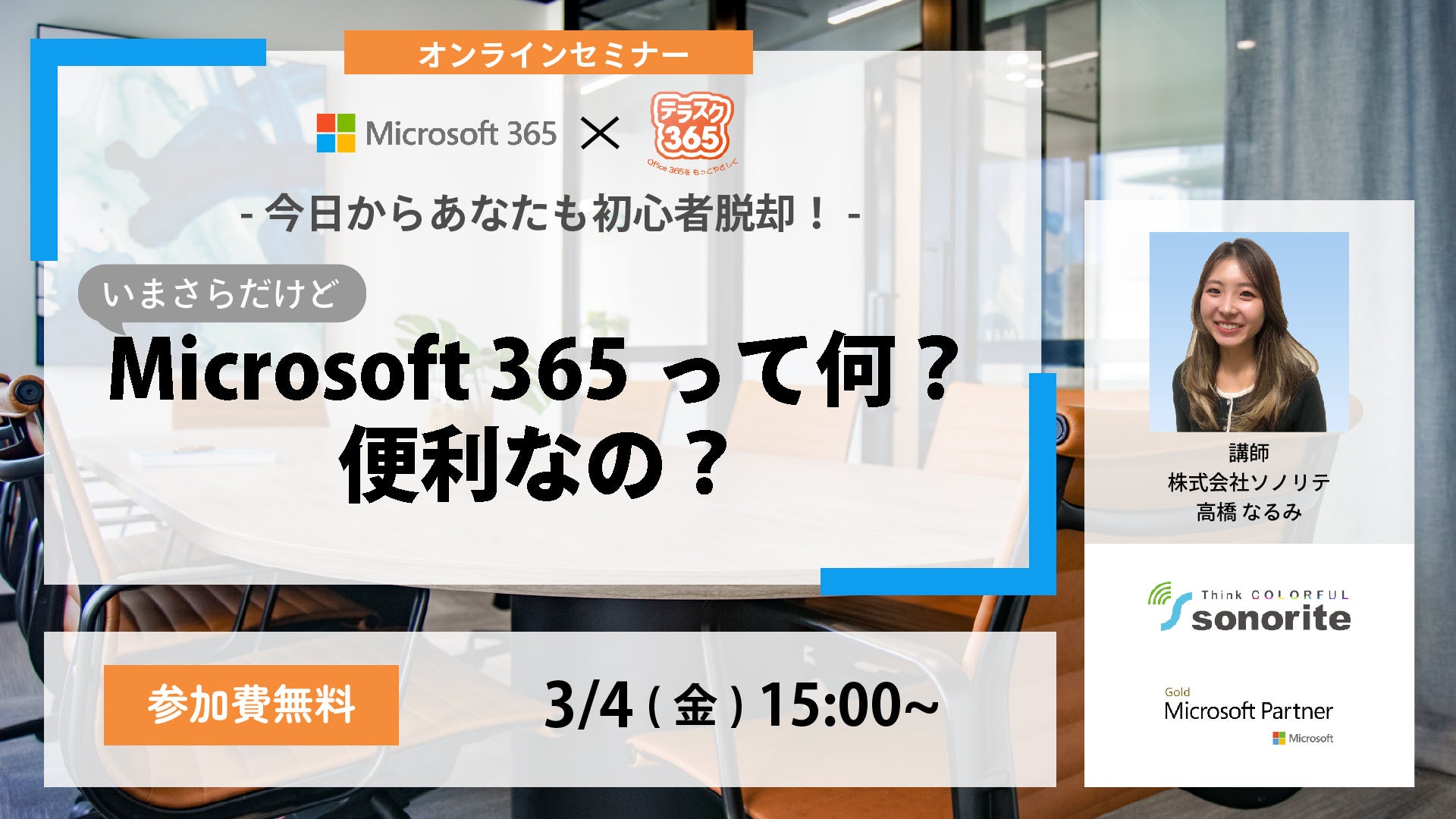 株式会社ソノリテ(本社:東京都千代田区、代表取締役:齋藤和政、以下ソノリテ)のコンサルティングサービス「テラスク 365」が新たに無料オンラインセミナーの開催をいたします。Microsoft 365 の利活用によって自社の業務効率アップにつながるヒントをご提供いたします。