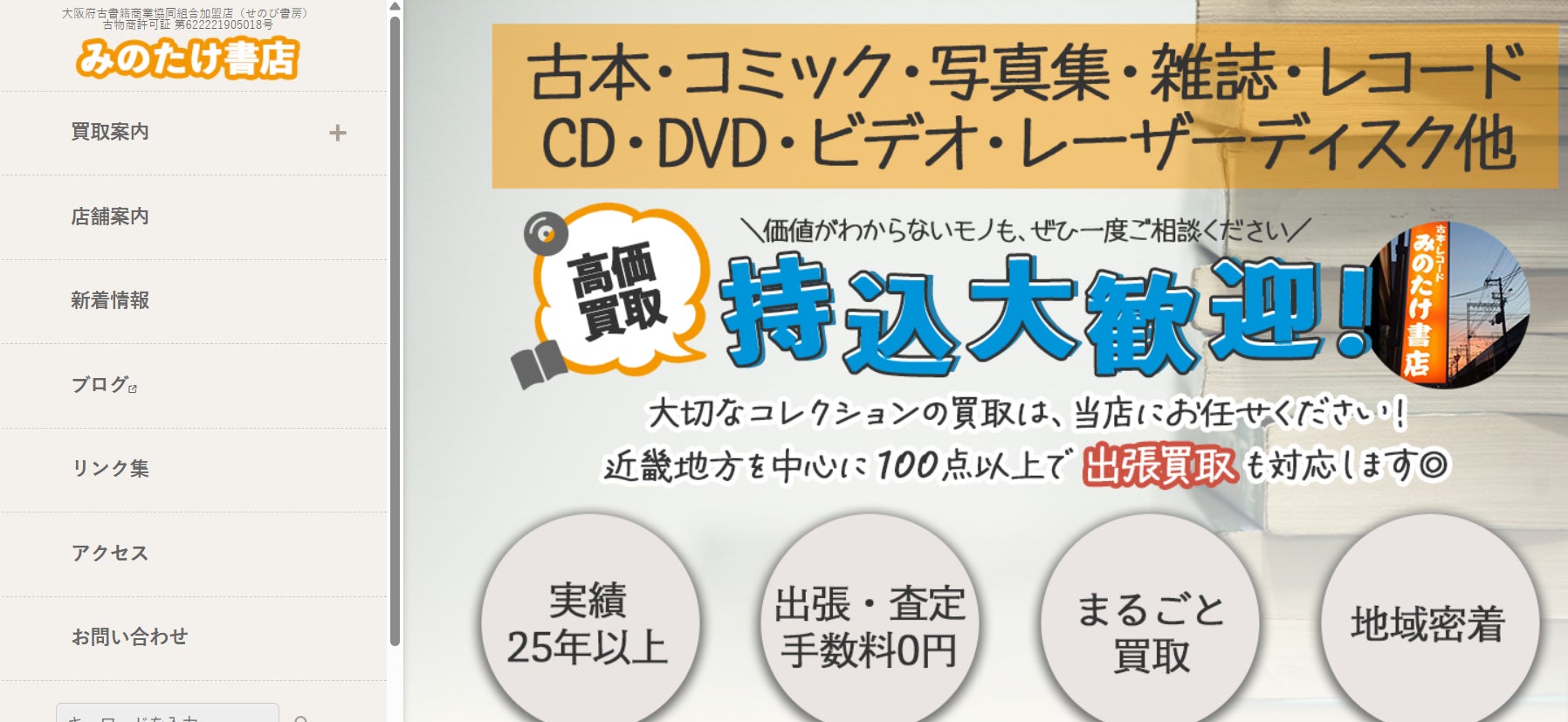 みのたけ書店は、大阪府東大阪市に店舗を構える創業25年以上の古書店です。古本・古書のほか、ゲーム、フィギュア、家具、楽器まで幅広い買取に対応しています。