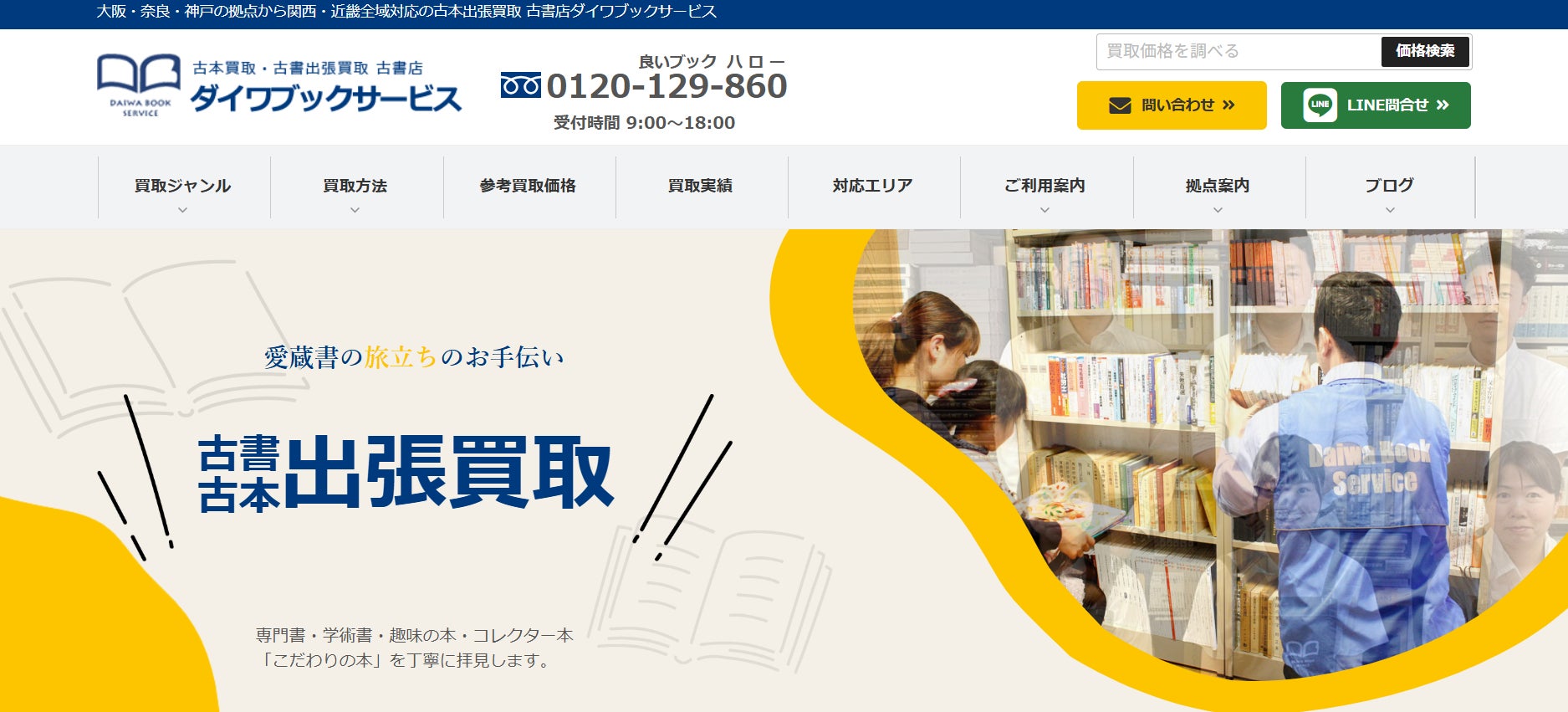 ダイワブックサービス 大阪営業所は、専門書や人文・自然科学系の古本買取に強みを持つ業者です。出張買取は約200冊から対応し、手数料は全て無料です。