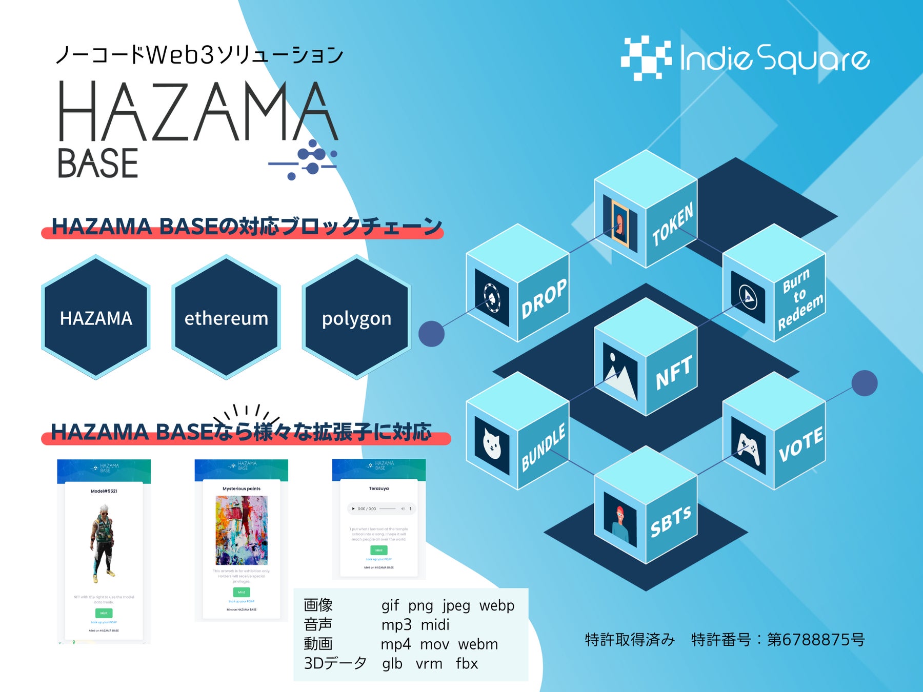 HAZAMA BASEは、誰でも簡単・基本無料でNFTの発行やDAO(分散型組織)を生成できるweb3プラットフォームです。「HAZAMA」、「イーサリアム」、「ポリゴン」、の3つのブロックチェーンに対応し、以下のコントラクトを簡単にブロックチェーン上に展開し、利用することができます。