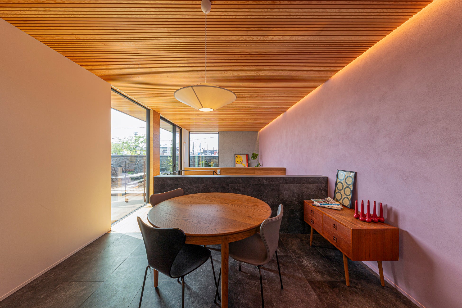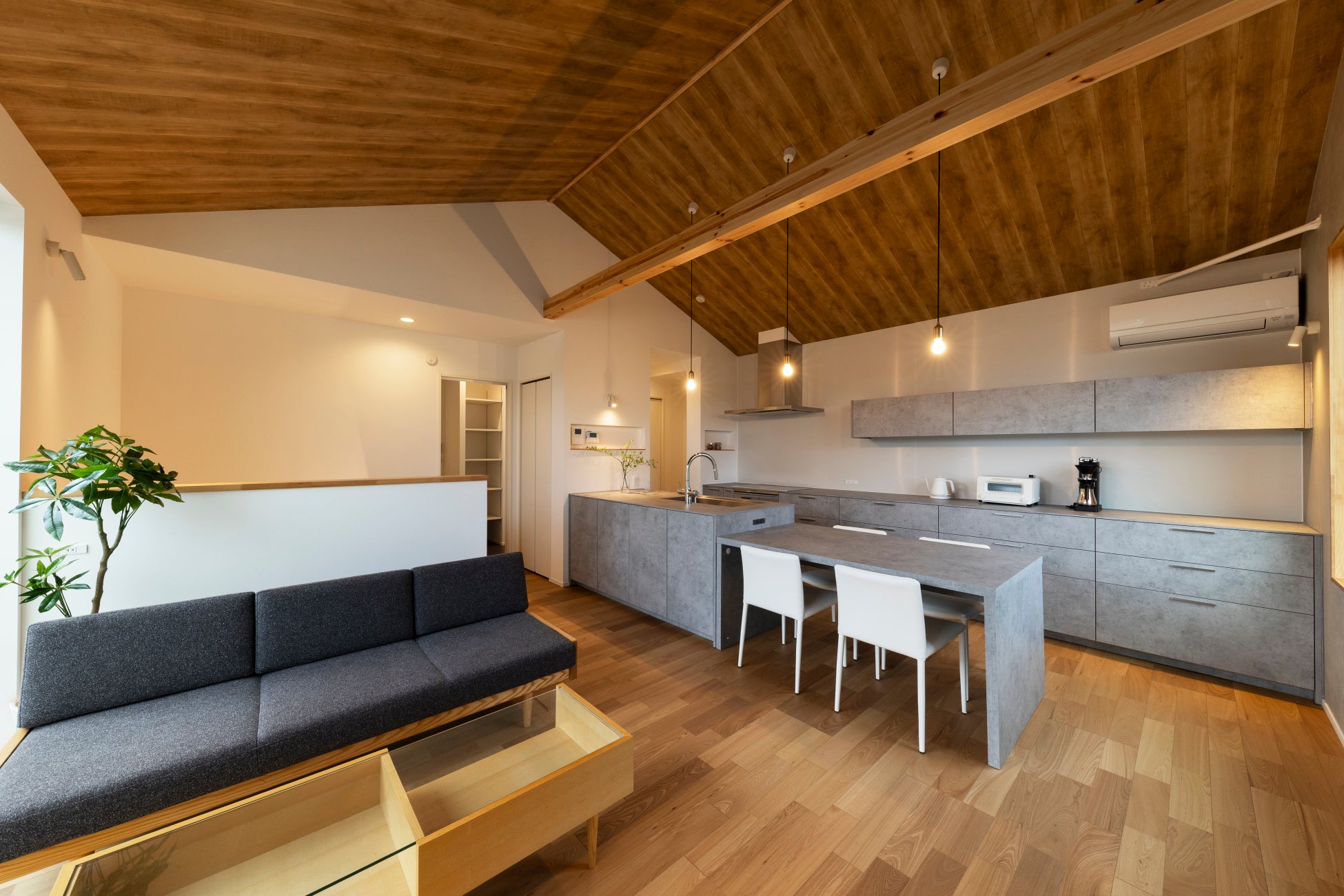 生実町という場所が少し喧騒とした街から離れ、緑も豊かな落ち着いた街並みでしたので、その雰囲気に合うように「モダンの中に落ち着きが生まれる住まい」を意識して設計しました。外観は、軒天と屋根の破風に木目を採り入れ、2階LDKの勾配天井も木目のクロスにすることで木の雰囲気が漂う落ち着いた住まいにしました。2階はLDKと水廻り、バルコニーがあり、コンパクトながらも開放的で住み心地が良くなるよう、回遊動線や各スペース同士のつながり、視線の流れなどを意識して設計しております。また夜になるとあえて光を通常よりも抑えて“ほんのり明るい、落ち着いた時間” を過ごせるのもこの家の魅力です。セミオーダーだからこそ実現できる“ちょうどいい住まい”を、ぜひ体感していただきたいです。