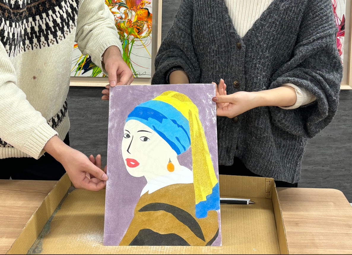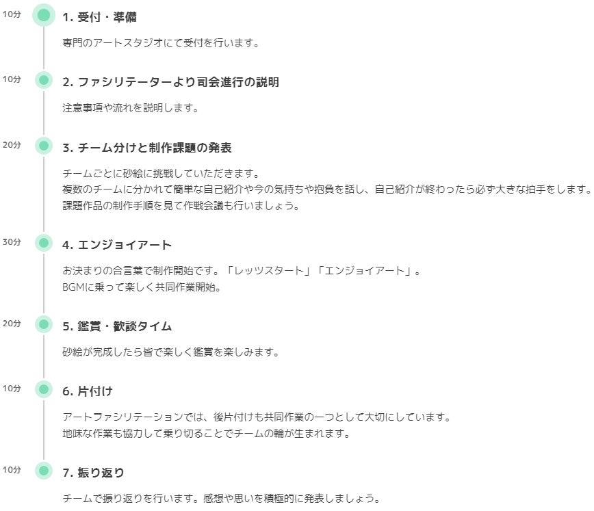 アートファシリテーションでは、様々な時代や地域の名画の砂絵を共同制作します。アートファシリテーターのアドバイスをもとに時間内にチームで一つの砂絵を完成させることで一体感が生まれます。みんなで描きあげたアートは、オフィスに飾るなどして楽しむことができ、制作後の思い出にもなります。