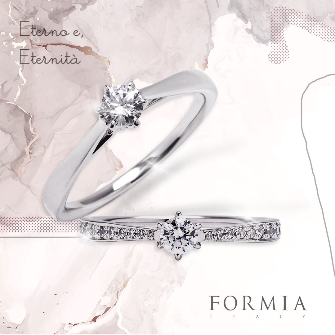 一粒ダイヤのソリティアタイプとして人気のETERNO(エテルノ)コレクション。フォルミアの代表的なエンゲージリング(婚約指輪)で、ストレートアームの着け易いデザインが人気。サイドダイヤが有るタイプと無いタイプから選べるのも嬉しいポイント。