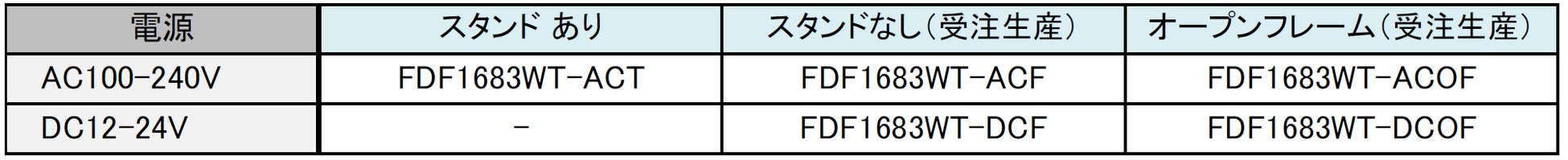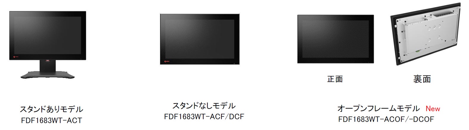 FDF1683WTは、キャビネットバリエーションに、標準モデルの「スタンドあり」、アームや壁掛け金具による設置に適した「スタンドなし」、機器への組込み・はめ込みに適した「オープンフレーム」の3種類を用意します。今回、当社が初めて提供するオープンフレームモデルは、従来のパネルマウントモデルとシャーシマウントモデル、それぞれの特長を兼ね備えた設計で、機器前面からのはめ込みと機器内への組込みの両方に対応し、さまざまな産業機器へ柔軟に取付けが可能です。さらに電源仕様も、一般的なAC電源に加え、DC12-24VのワイドレンジのDC電源に対応したモデルを用意し、幅広い環境に対応します。